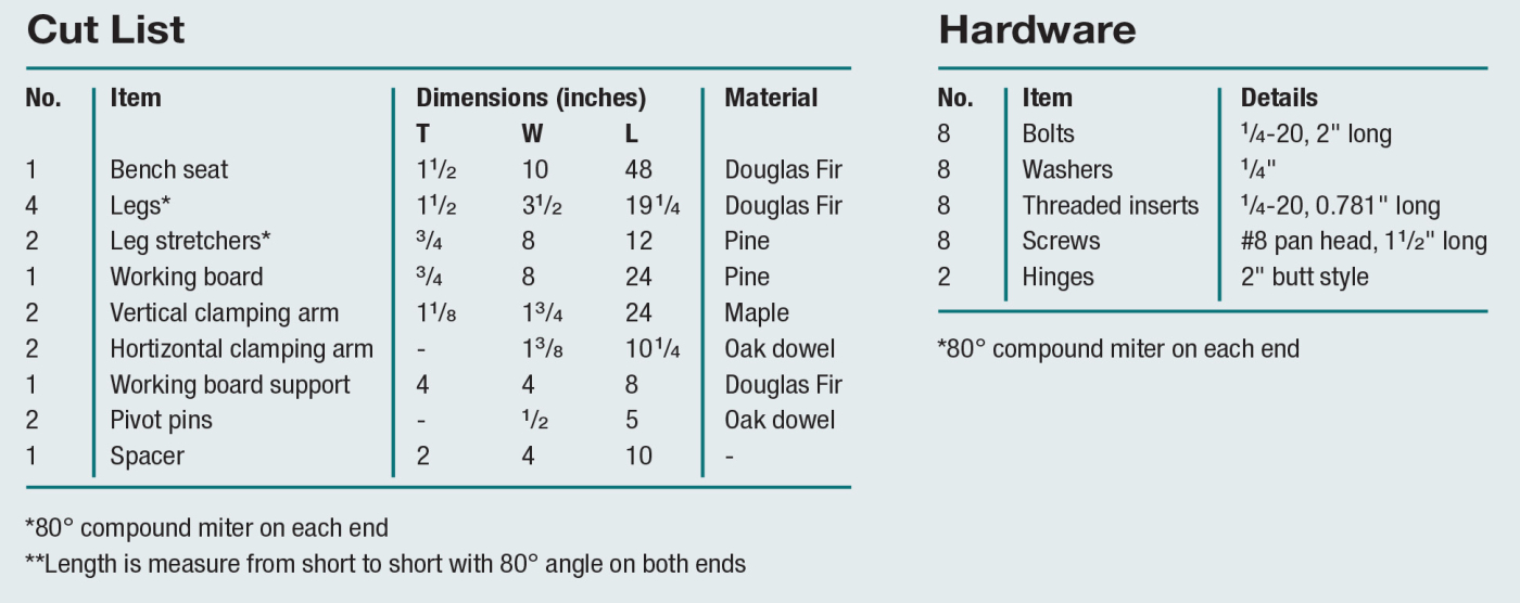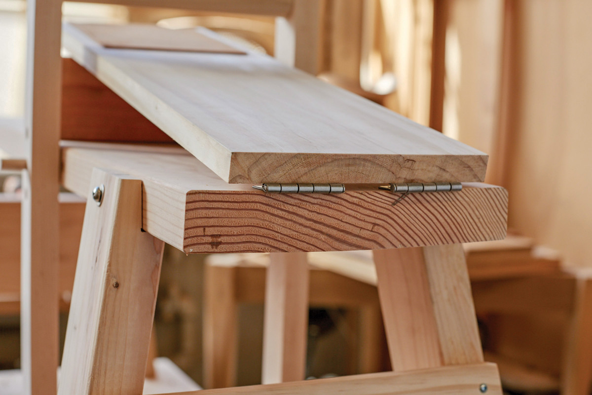 11. The working board is attached to the bench with a pair of butt hinges. It’s made to move to accommodate different thicknesses of wood in the clamp, but folds flat against the bench when not in use.