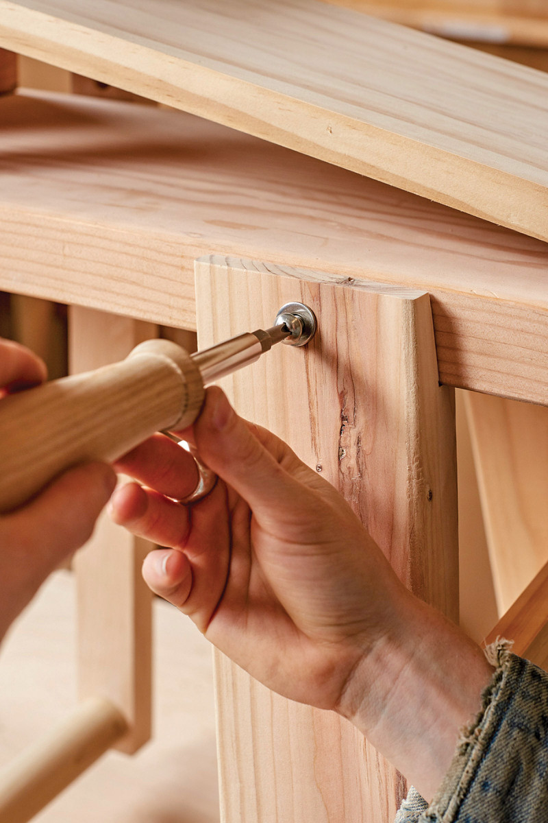 Scribe a line 6-1/4” up from the bottom of both legs. Align the bottom of the stretcher with your lines. Check that the stretcher is flush with the outside of the legs, and clamp in place. Pre-drill and attach four pan head screws, one in each corner of the stretcher. Repeat the process with the second pair, and set both leg units aside. You’ll find they can stand upright on their own, which always brings me a sense of satisfaction having built a well-balanced structure.