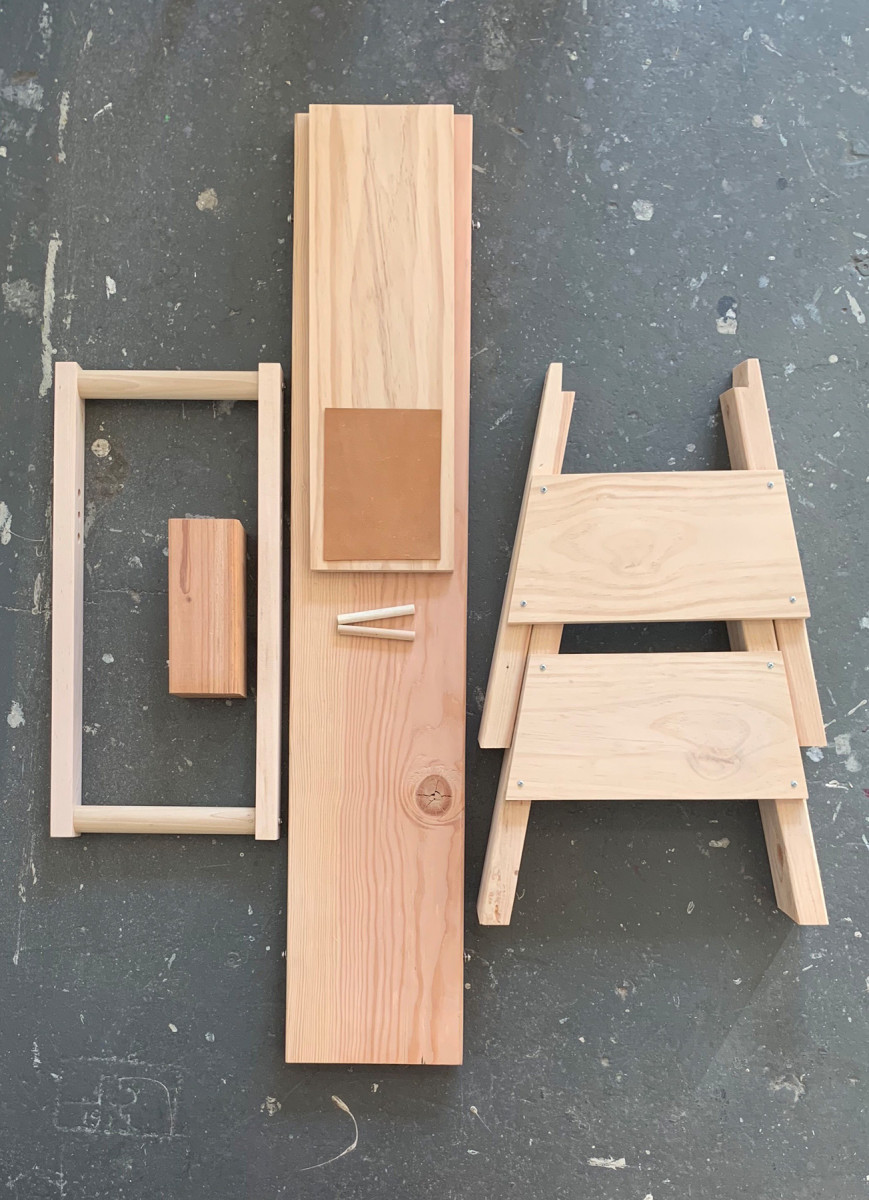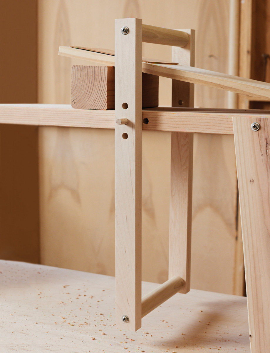 I was based in Brooklyn, where finding space to work is one of the greater challenges. Many woodworkers make-do with small shared workshops or even their apartments. With this in mind, I approached Joel Moskowitz at Tools for Working Wood with the idea to teach a knockdown shave horse class. He said, “Great, come up with a design!” We agreed the design should have the stability and strength of traditional shave horses, paired with the option to be broken down. The resulting design uses affordable materials, is buildable in a short period of time, and is easily disassembled and stored. Tools for Working Wood offers a hardware kit (including full plans). The building of the bench itself requires minimal machinery, and the finished product uses threaded inserts and bolts to allow the legs and clamp arm unit to be easily removed.