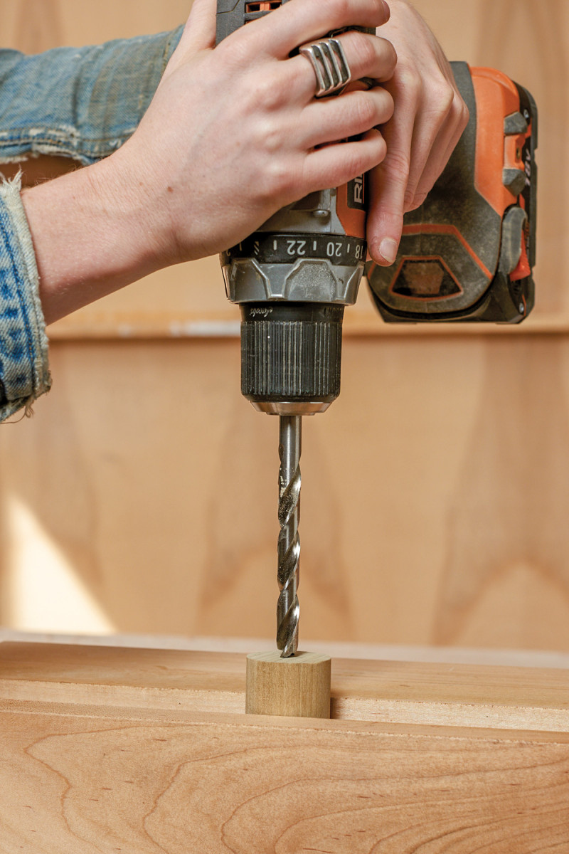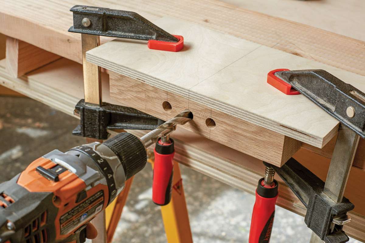 7. I use a simple jig to drill the three pivot pin holes along the sides of the bench board. The jig is just a scrap of hardwood and a piece of plywood to guide the drill straight into the center of the bench board.