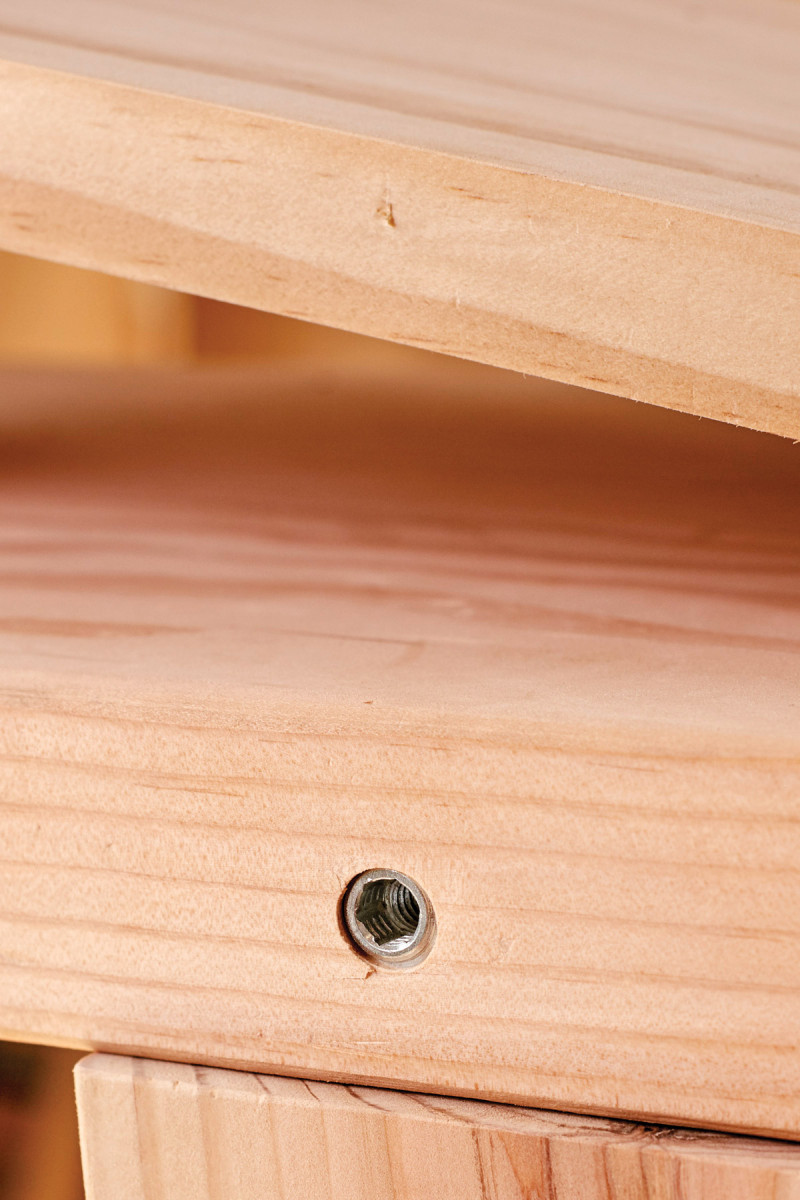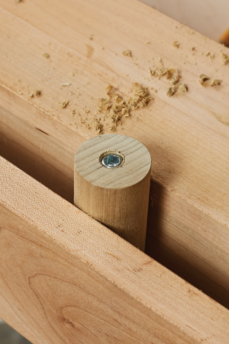 8-10. Clamp your two sets of legs in place and drill for the threaded inserts. Do one insert at a time, first drilling through both the leg and the bench with an 1/8″ pilot bit.