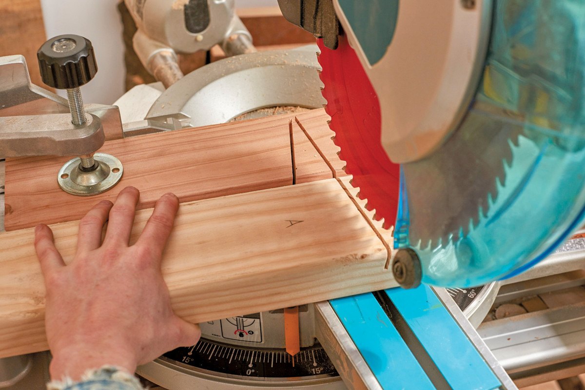 2. I make a non-through cut, halfway through the thickness of the leg, on a sliding miter saw to establish the depth of the shoulder. This uses the same compound 80° angle as the top and bottom leg cuts. The sacrificial fence is there to make sure I’m able to cut the depth all the way through and limit blowout on the back of the cut.