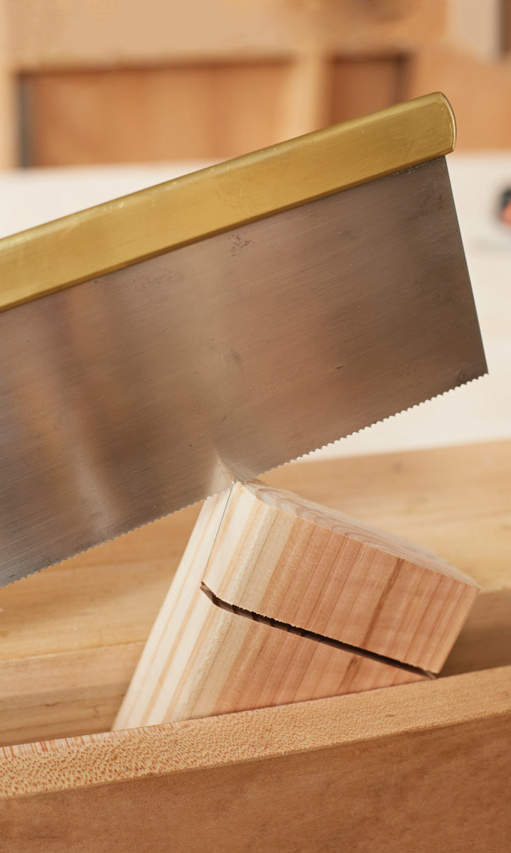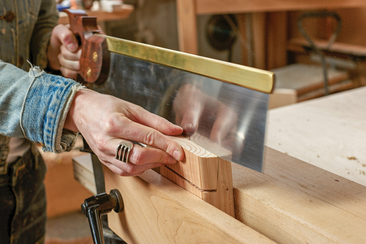 Start by sawing at 45° to the corner of your board. Remember, saw on the waste side of your line. Following your scribe, saw down to meet the depth cut established by the miter saw. Next, make a shallow cut straight across the end grain perpendicular to the leg, cutting just deep enough to establish the kerf to the other side of the leg. Rotate your leg and saw the other side at a 45° angle down to the shoulder-depth cut. You should be left with a clean and straight outline for your shoulder—cut the remaining material away. After sawing, clean up any unevenness with a chisel to allow your bench seat to sit snugly in each shoulder.