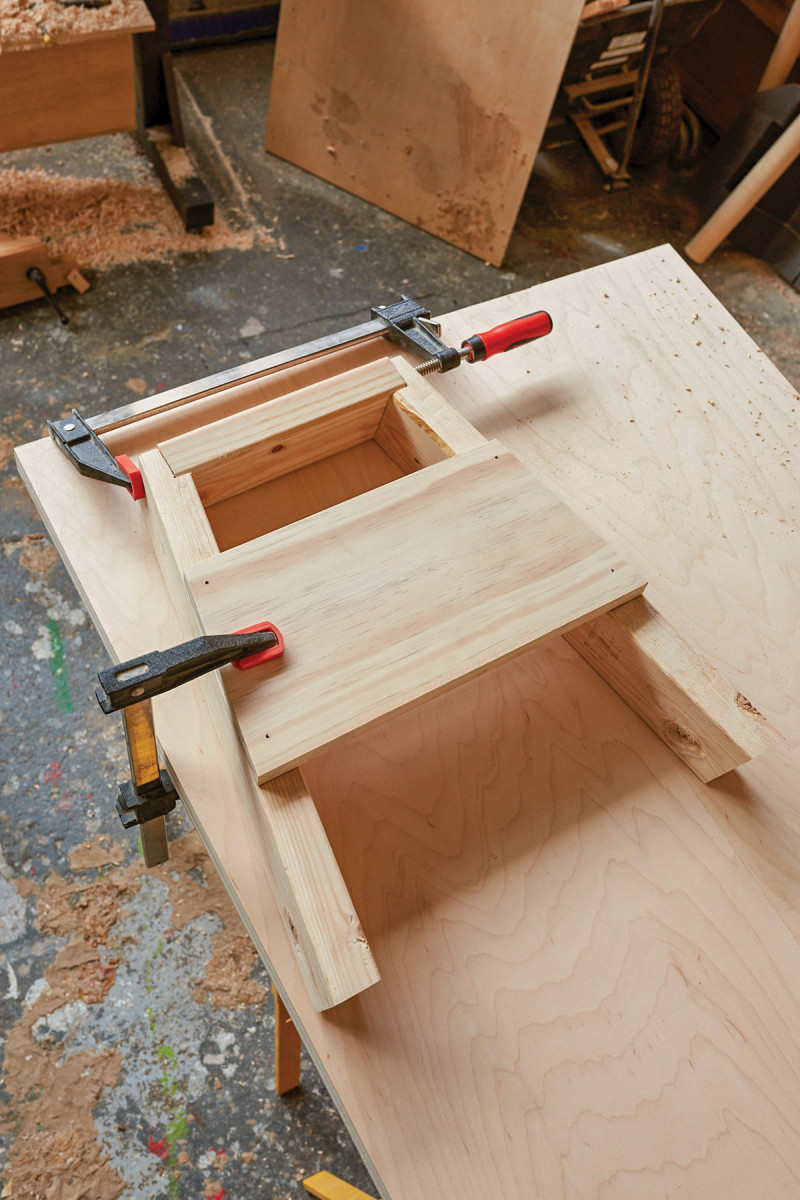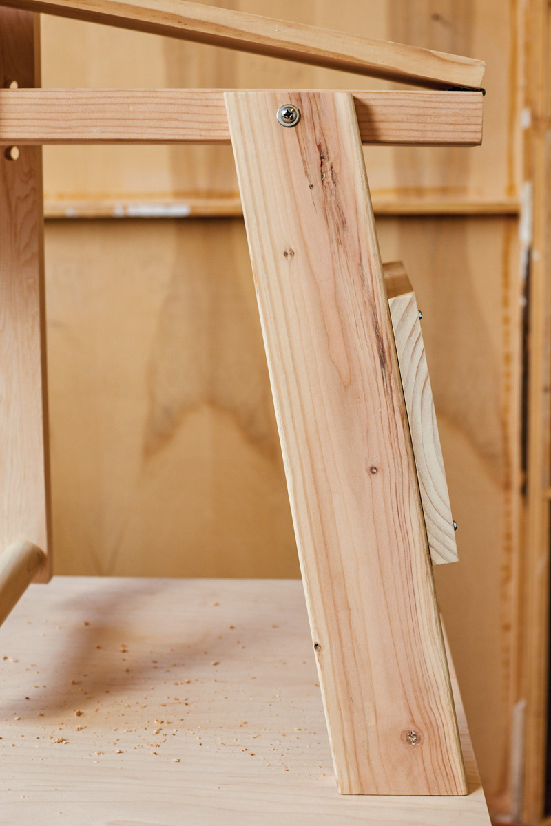 6. Attach the stretchers for each pair of legs, paying special attention to their orientation. A spacer, cut to the same width as the bench board, helps keep things aligned.