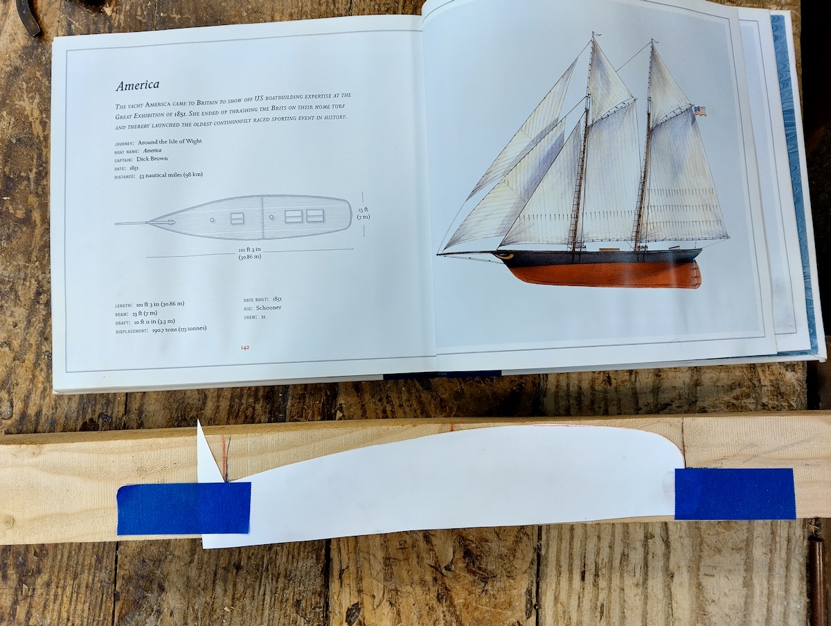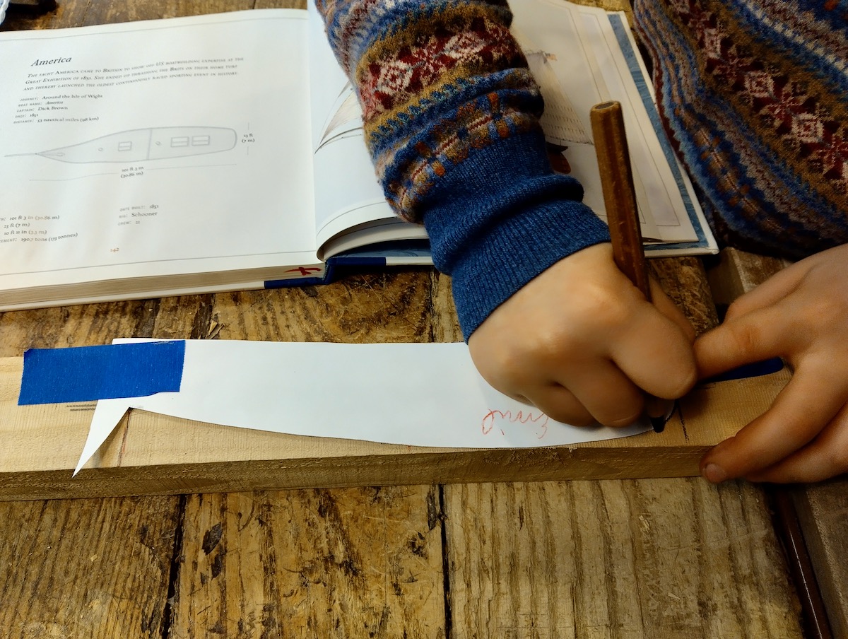 Each year, in my woodworking classes, I guide a few of my 4th-grade—and occasionally 5th-grade—students through the process of building a small sailboat from a solid block of wood. Our model designs are based on classic sailboat forms, and we begin with inspiration. On the shop bookshelf is a beautifully illustrated reference (Notable Boats: Small Craft, Many Adventures) filled with stories of small boats that accomplished big things—breaking records, surviving epic journeys, or standing out for their beauty. The book includes plan views (top decks), elevations (side profiles), and sometimes cross-sections of the hull—images that help students understand how boats are structured and what makes them seaworthy.
