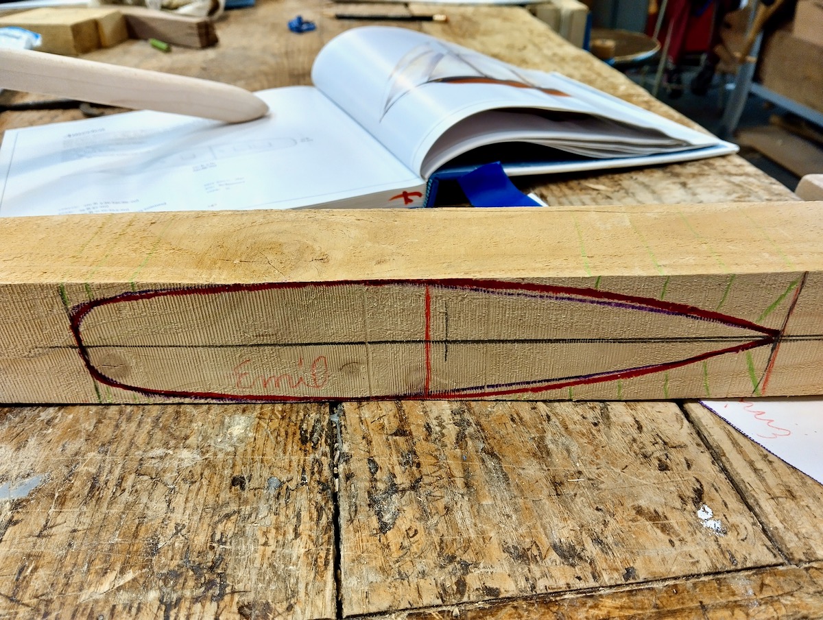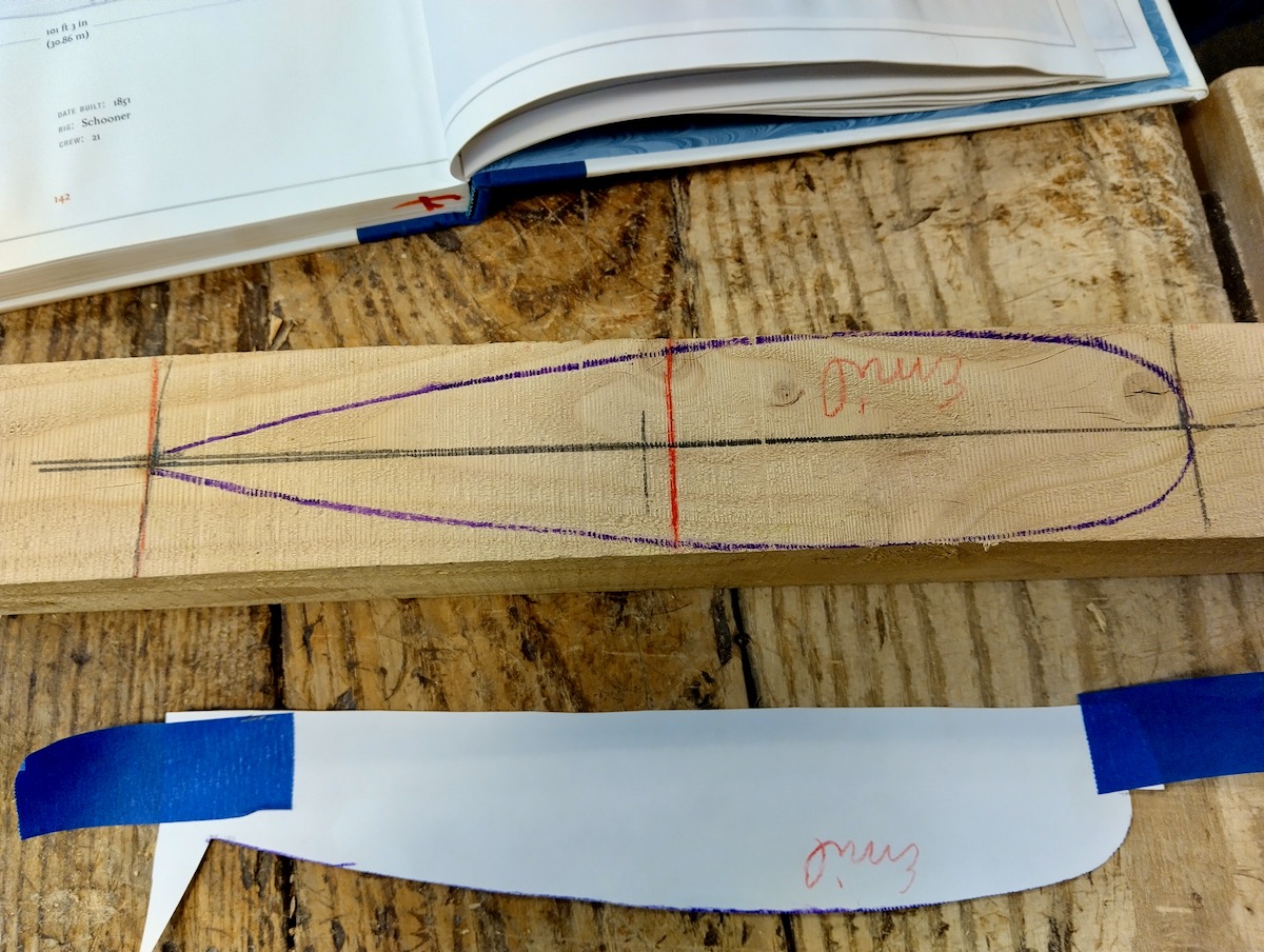 We begin by having the student sketch one half of the boat’s deck (top view) on paper. Once satisfied with the shape, they cut a cardboard template of that half. This template is then used to transfer the design symmetrically to a piece of softwood—usually a 2×4 or 2×2, depending on the scale of the build.