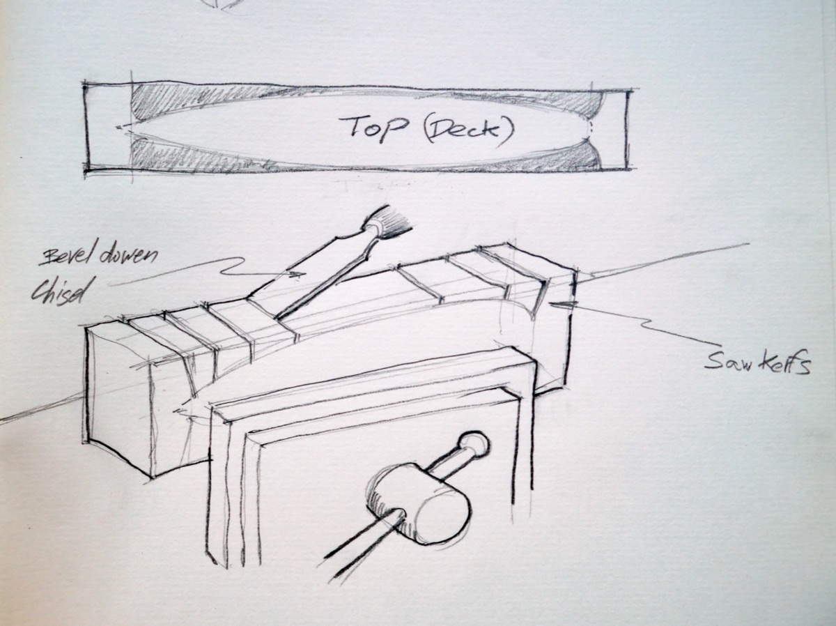 Before we begin gouging to remove the access wood around the hull, we mark the kerf lines and, using a saw, cut them down.