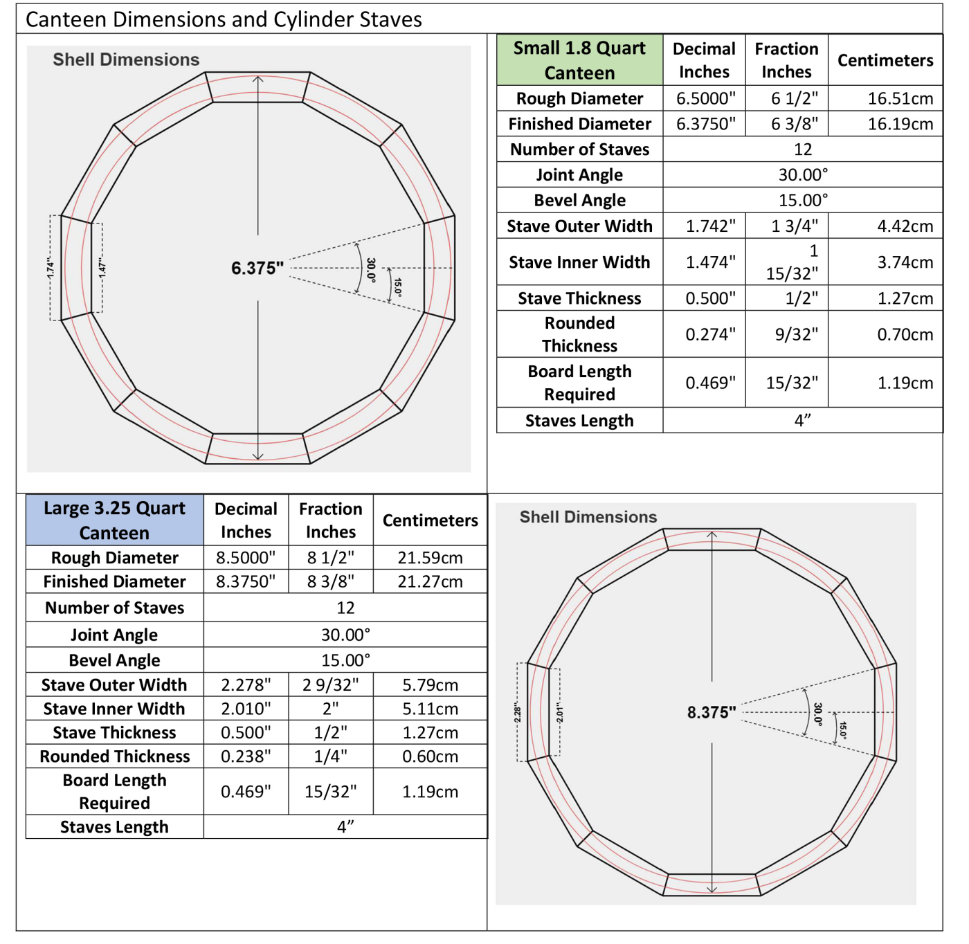 The article from Wood Magazine about working with staves and segments details the mathematics of calculating of how big it will be. Great, if you are designing a porch post or even a canteen. But I have done all of that for you. No math calculating needed. My prototype canteen was about 8.5 inches in diameter. It turned out pretty big, and by mathematics, it holds about 3⁄4 of a gallon. Enough for a long march, but I think every day use a smaller 1 quart would probably suffice for SAR uniform kit. With this in mind I am providing a table for the dimensions for both the larger 3⁄4-gallon sized canteen and the smaller 1-quart canteen in the following tables.