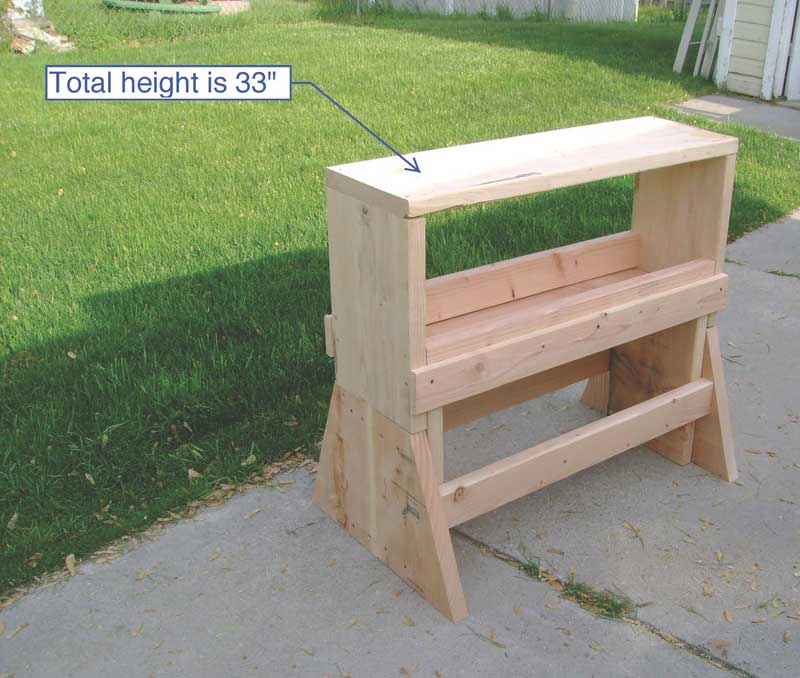 | I usually need a pair of sawhorses when I’m working outside the shop, but sometimes I also need a bench. Here’s both, rolled into one. The bench is actually a pair of sawhorses that stack to together.