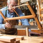 2. Crosscut the 14″ piece to make the two wing supports (M). From the remainder, cut two pieces to make the stretcher (C). Cut these pieces 1/4″ extra wide and 1″ extra long. Glue them together to make a blank that’s 1-1/2″ thick. Once the glue is dry, rip this piece to final width, but leave it extra long.