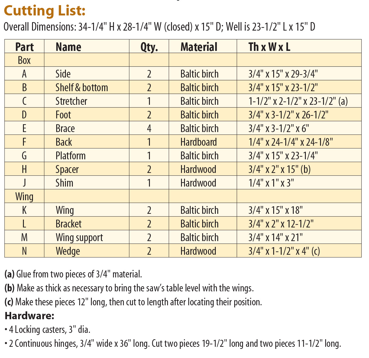 1. Rip the sheet approximately in half, at 30-1/2″ (see Cutting Diagram, page 52). Rip the 30-1/2″ section into two 15″ wide pieces. Rip the other section into one 15″ piece and one 14″ piece. From the three 15″ pieces, cut the sides (A), shelf and bottom (B), platform (G) and wings (K).