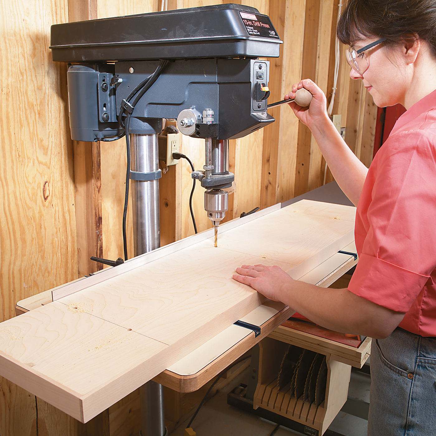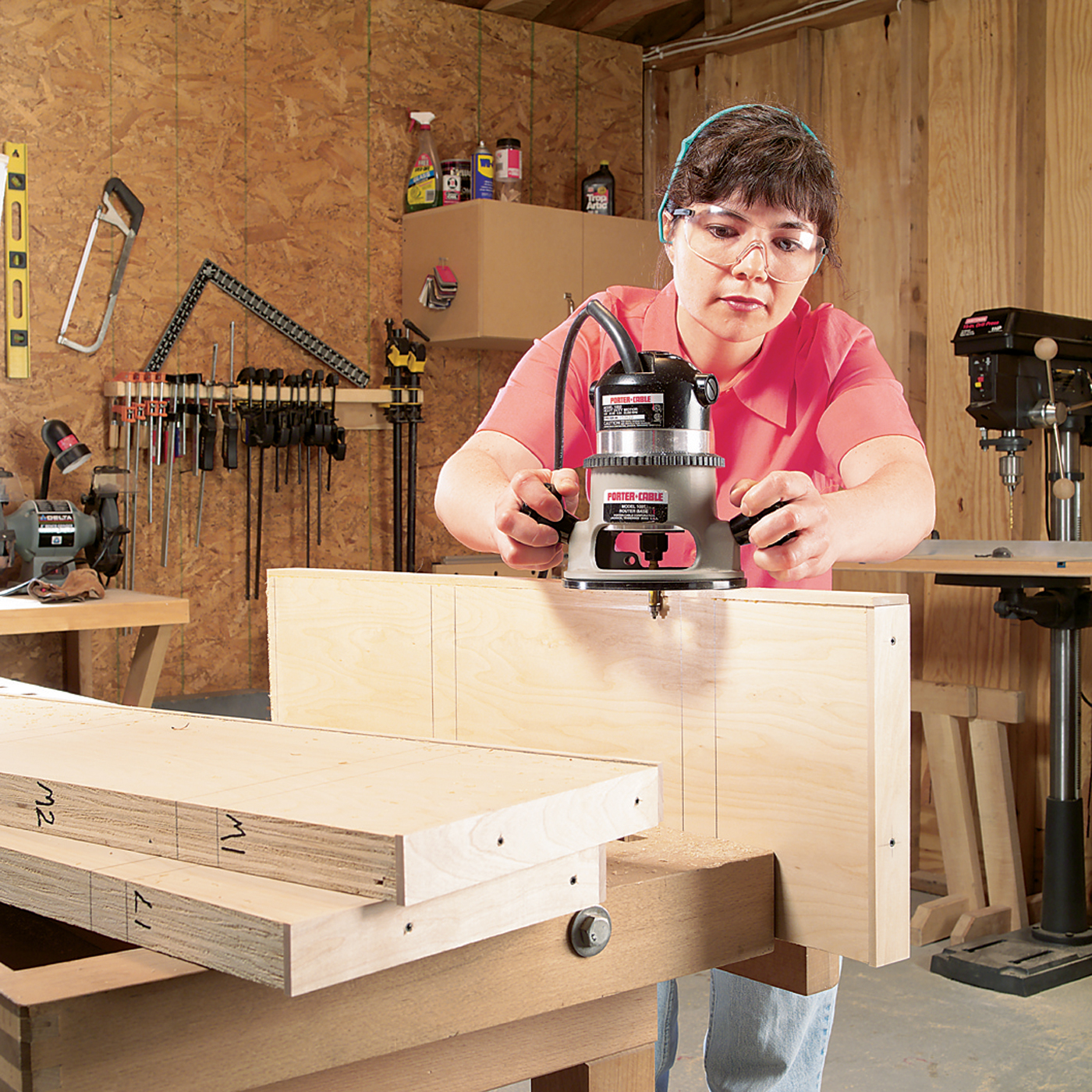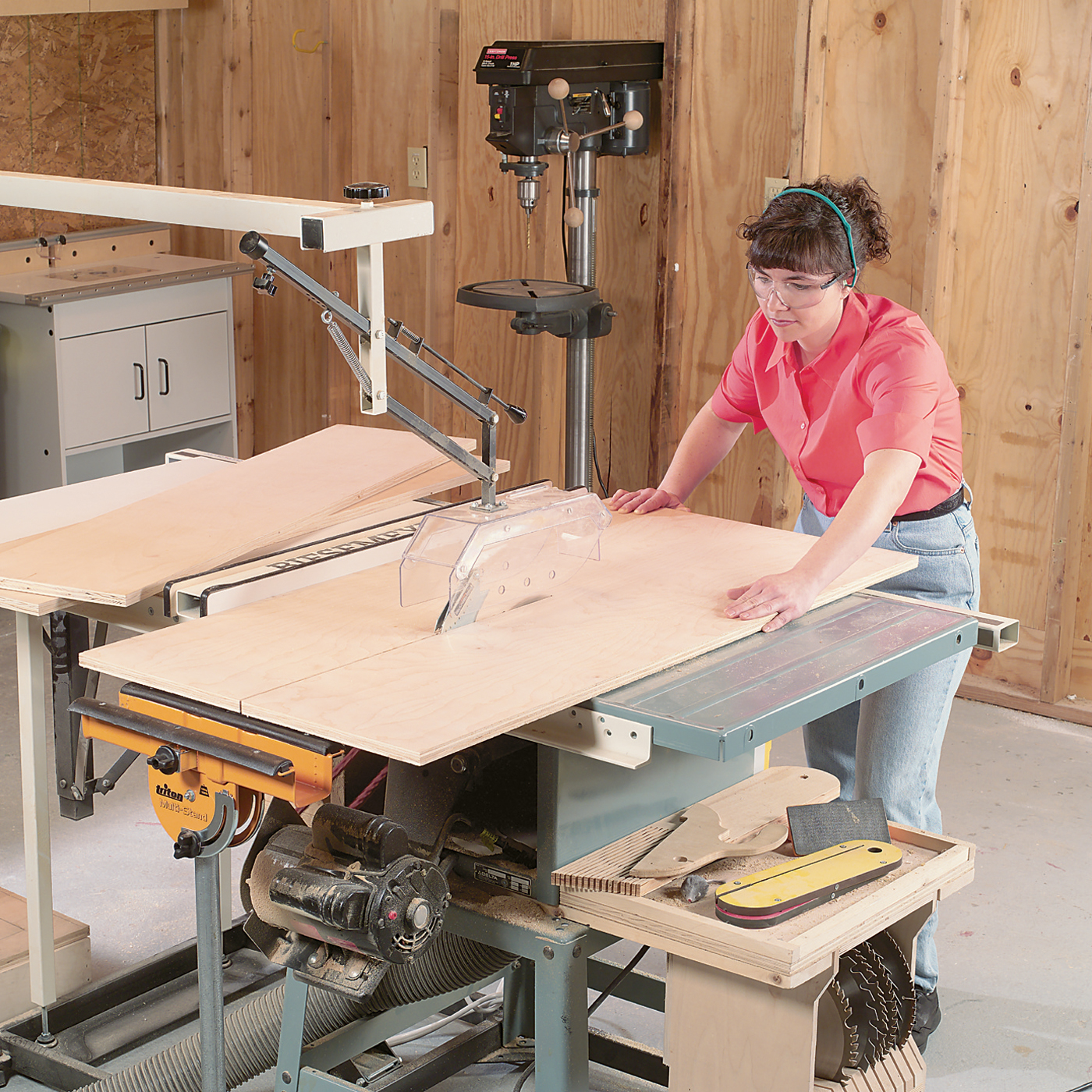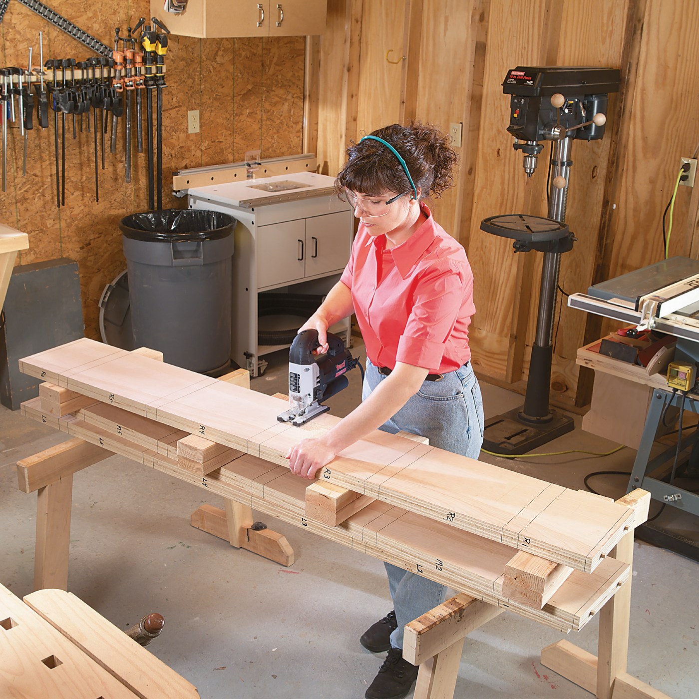 For tools you’ll need a tablesaw, dado blade, jigsaw, sliding miter saw, planer, jointer, drill press, hand drill, router, and router table. If you don’t have a sliding miter saw for the wide crosscuts (step 11) use a tablesaw sled instead.