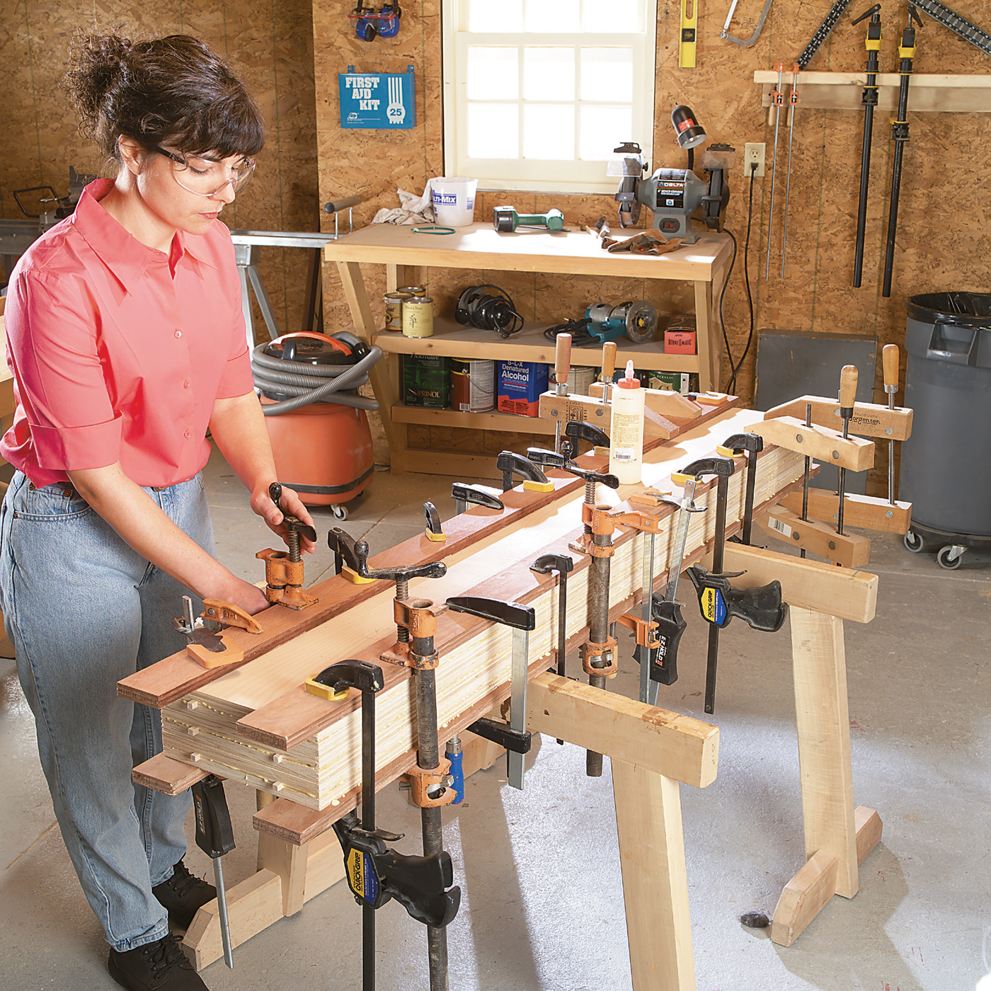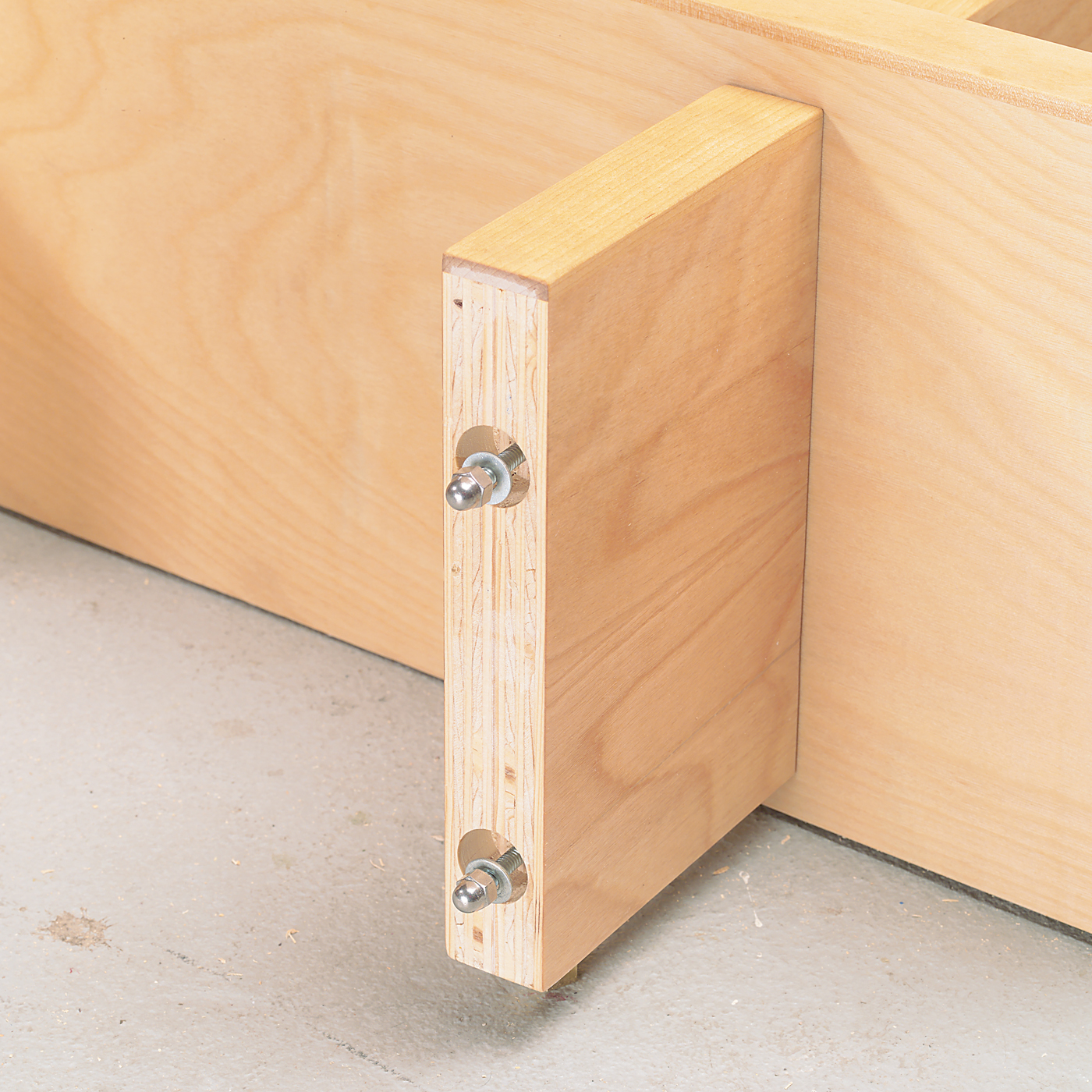 The backbone of this bookcase is the laminated plywood parts. They make it strong and stiff and give it the look of solid wood. The laminations also provide an easy hiding place for the threaded rods that hold the parts together.