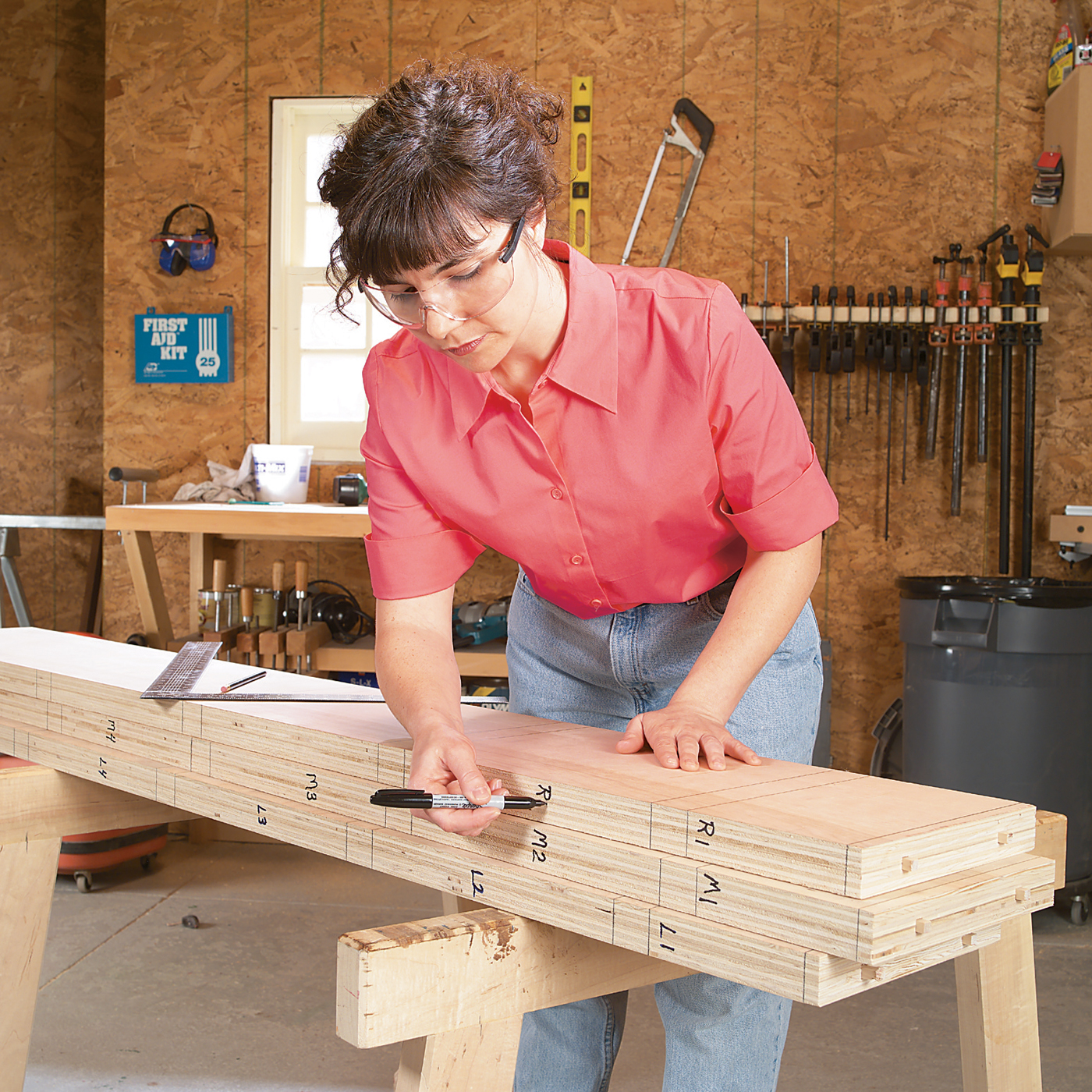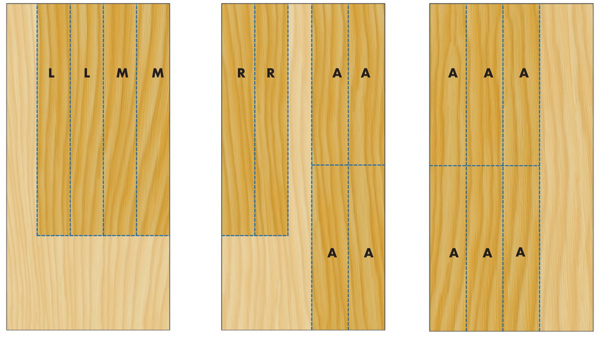 5. Label the individual vertical partitions (parts L, M and R) on the long panels.The markings help you rematch the grain during final assembly. Use the letters L, M and R for left, middle and right and number from the top down.The double lines represent the location of the shelves and will be cut away when the sections are sawn apart.