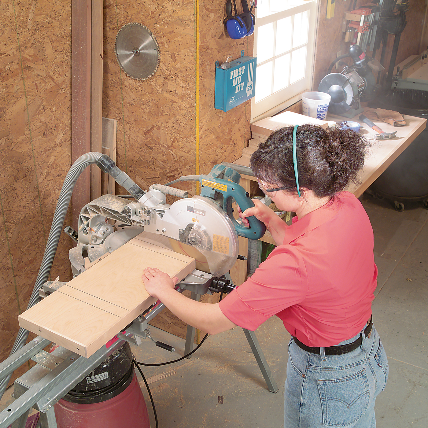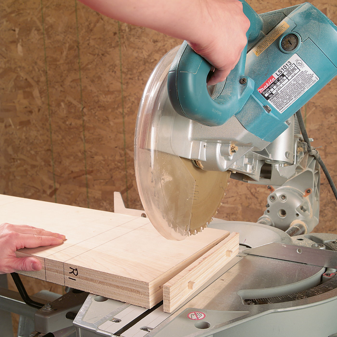 7. Trim the top end of the vertical partitions to final length (parts L1, M1 and R1). Cut the glued-up shelf panels (parts A) to final length at this time also. A sliding miter saw is a great tool for this job because it’s quick and accurate. Prescore the plywood to reduce veneer chipping.