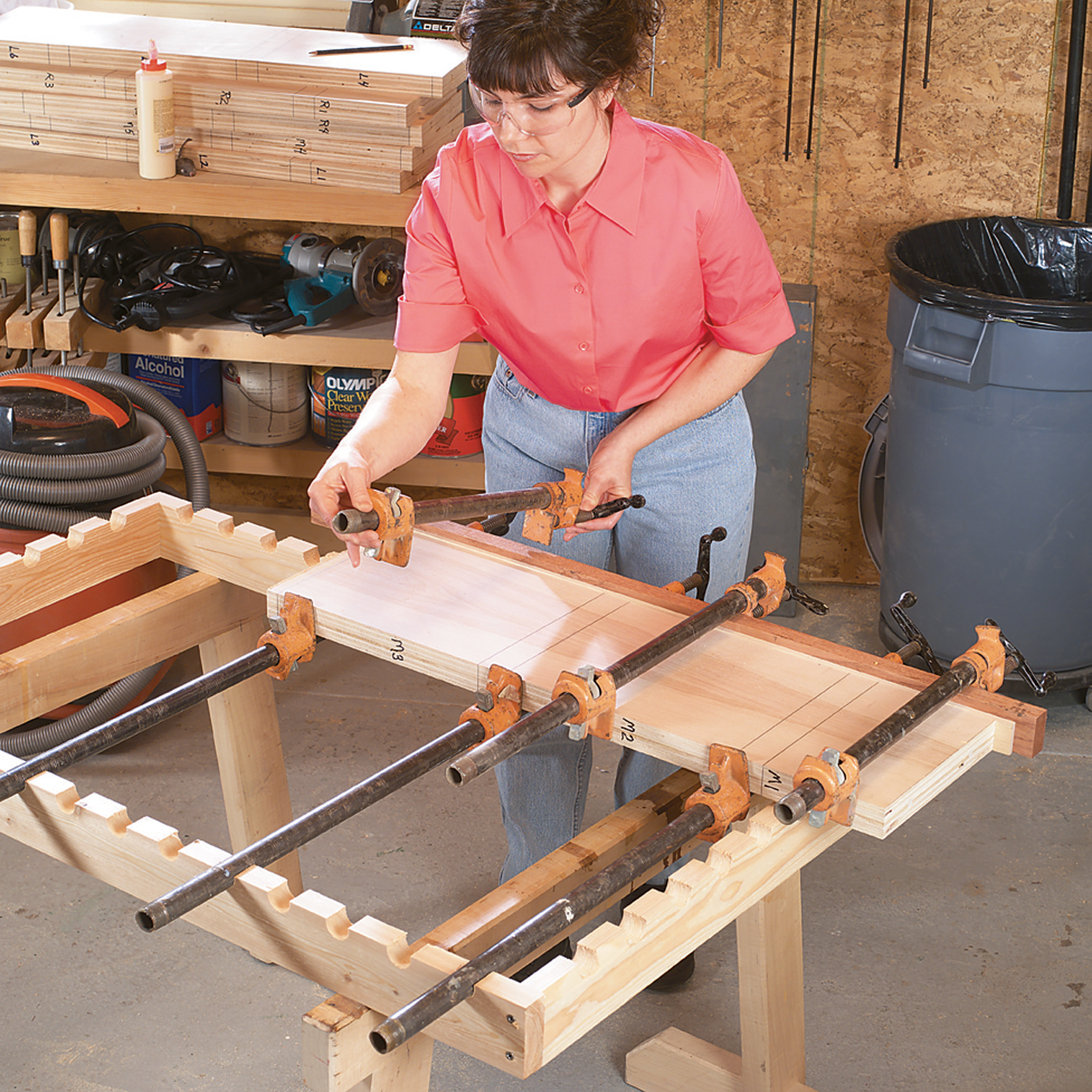 3. Glue together the panel halves for the vertical partitions (parts L, M and R).We glued up all three pairs at once to help keep them flat. This is a big glue up, so use a slow-drying glue. Use 5/16-in.-square wood pegs at both ends to keep the panels aligned. The pegs get drilled out later. Use clamping cauls (seen below) to protect your plywood. If you don’t have enough clamps, you can precut your panels in half and glue them up as shorter sections. (Use square alignment pegs in both ends of these shorter panels, too.) This is also the time to glue and clamp the plywood for the shelves parts A).