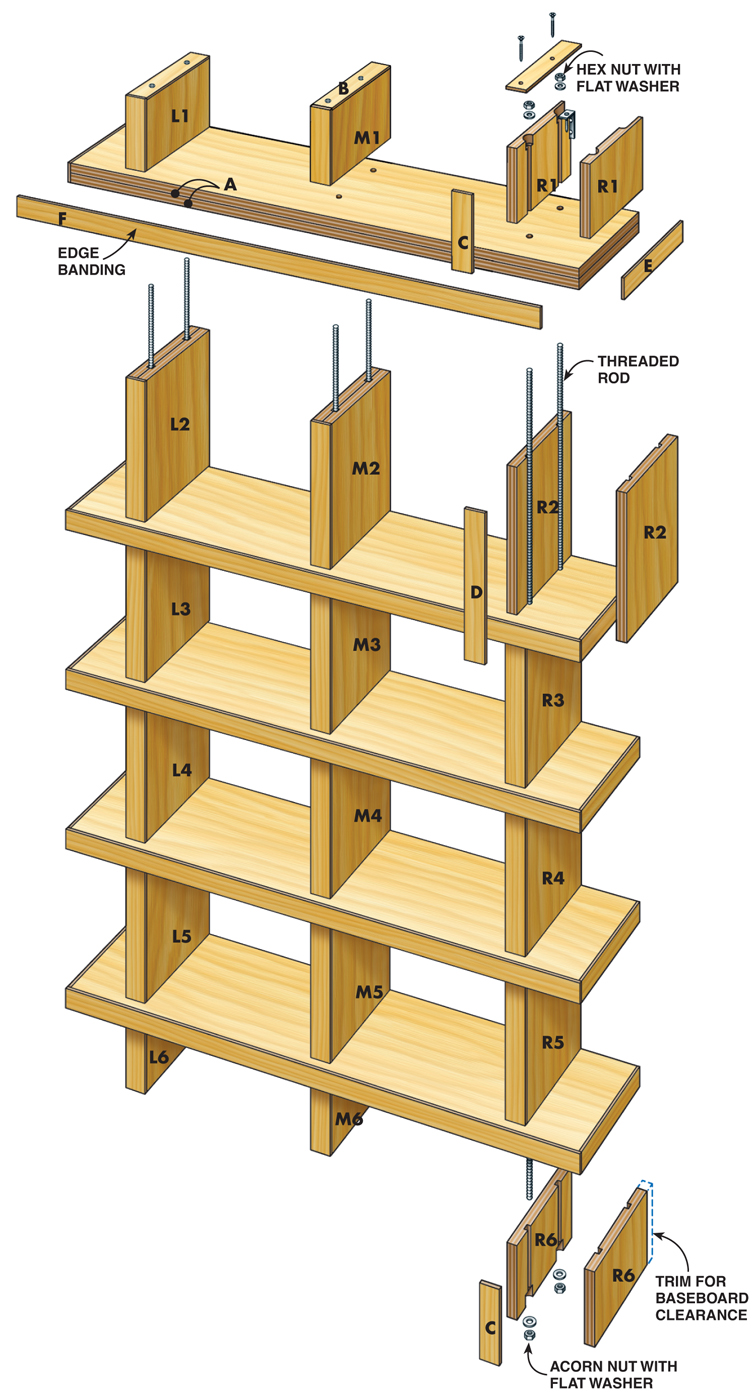For you, the woodworker, this bookcase has beauty of a different kind. The joinery is amazingly simple: Long threaded rods are concealed inside the pieces and tie the whole bookcase together. There are no angles to cut, no mortises, no traditional joinery of any kind. And finishing is a breeze because all the parts are finished separately before they’re put together. You can buy all of the wood and hardware at a home center.
