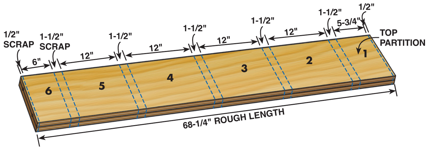 11. Crosscut all the vertical partitions (parts L, M and R) to final length.