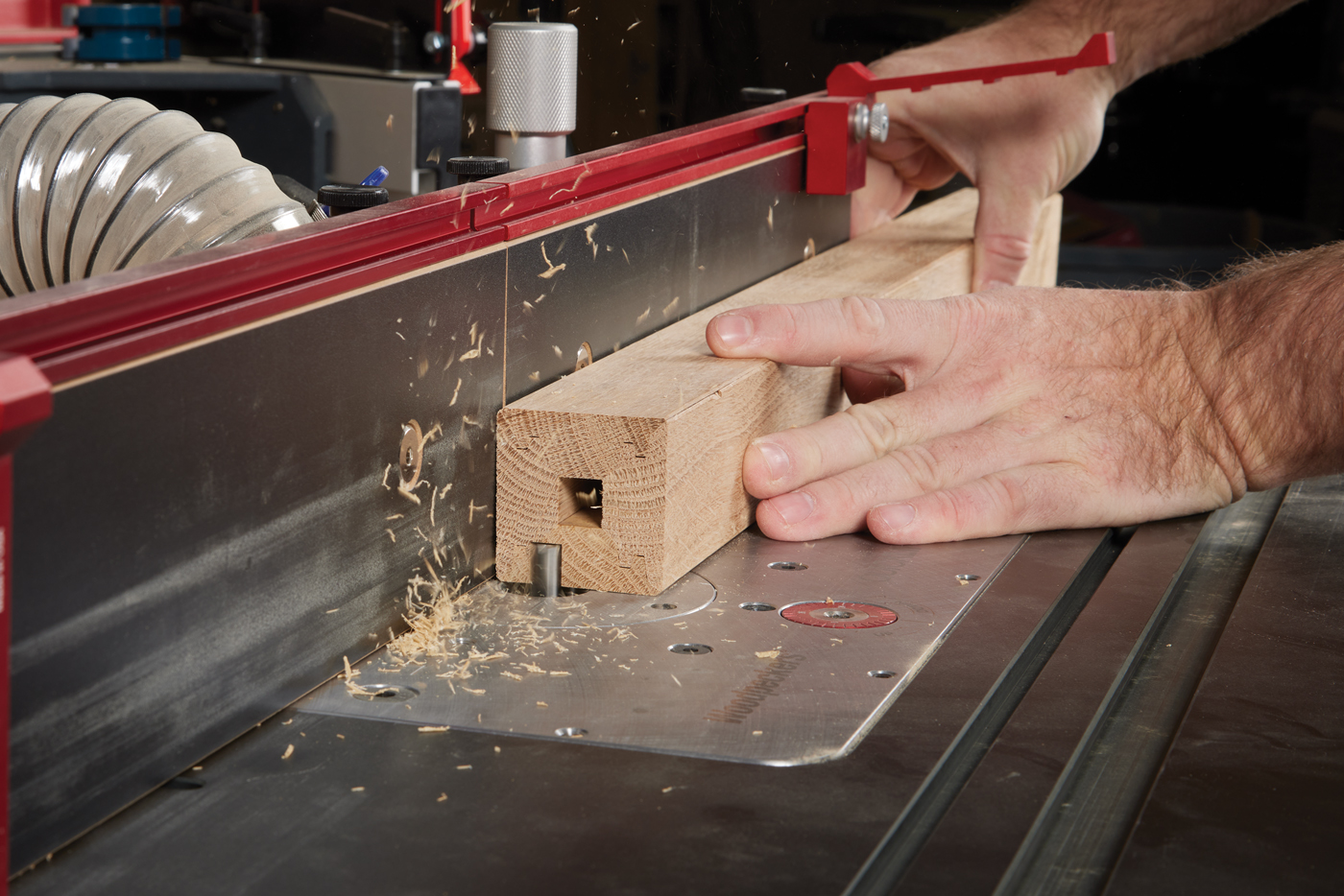 Once the set up is dialed in, you can rout your parts. You’re going to rout eight pieces in each orientation, both edges of each. This will yield enough parts to put together four perfectly quartersawn legs. I’m going to point out that I cut this locked miter (and many other parts later on) on my shaper—it’s a tool that’s been around a long time and I think is under utilized in the shop. Keep an eye out for a future article focused on shapers.