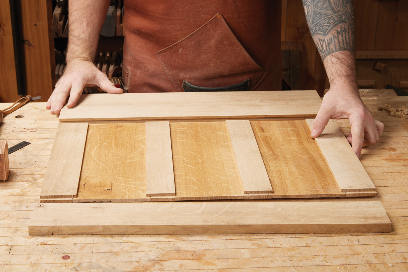 Now comes the show stopper. I think the top of any desk or table is one of the most important pieces. It’s the largest area and sees the most attention and use. I started with extra-thick stock. Trying to find 8/4 boards of bur oak that were relatively clean was a chore. However, luckily, I have a large stash and a skid loader to uncover some in my dried lumber stock. Even these have a brown “birthmark” on one of the boards. I like the character.