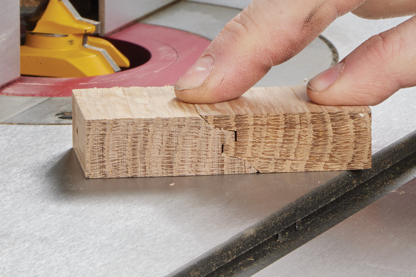 If you’ve never used a locking miter bit, here’s a little info. Basically, the bit creates a miter with a tongue and a groove on it. These lock into the mating parts. Two parts of the leg are routed against the fence (photo 4), and the other two are routed laying flat (photo 5). The set up is a bit tedious — requiring a delicate balance of bit height and fence location. A lot of test cuts are necessary, but it’s not difficult to dial in. First, you’ll want to test your set up laying the piece flat. Cut a test, then chop that piece in half, so that you can match the joint to itself (photo 2). If the surface is flush, perfect. If it’s not, adjust the bit and test again. Next, you can cut a test with the part flat up against the fence (photo 4). Do the same thing — cut the test piece apart and check it (photo 3). If the faces are flush, fit your first test together with the second one, and see if it’s a tight miter.