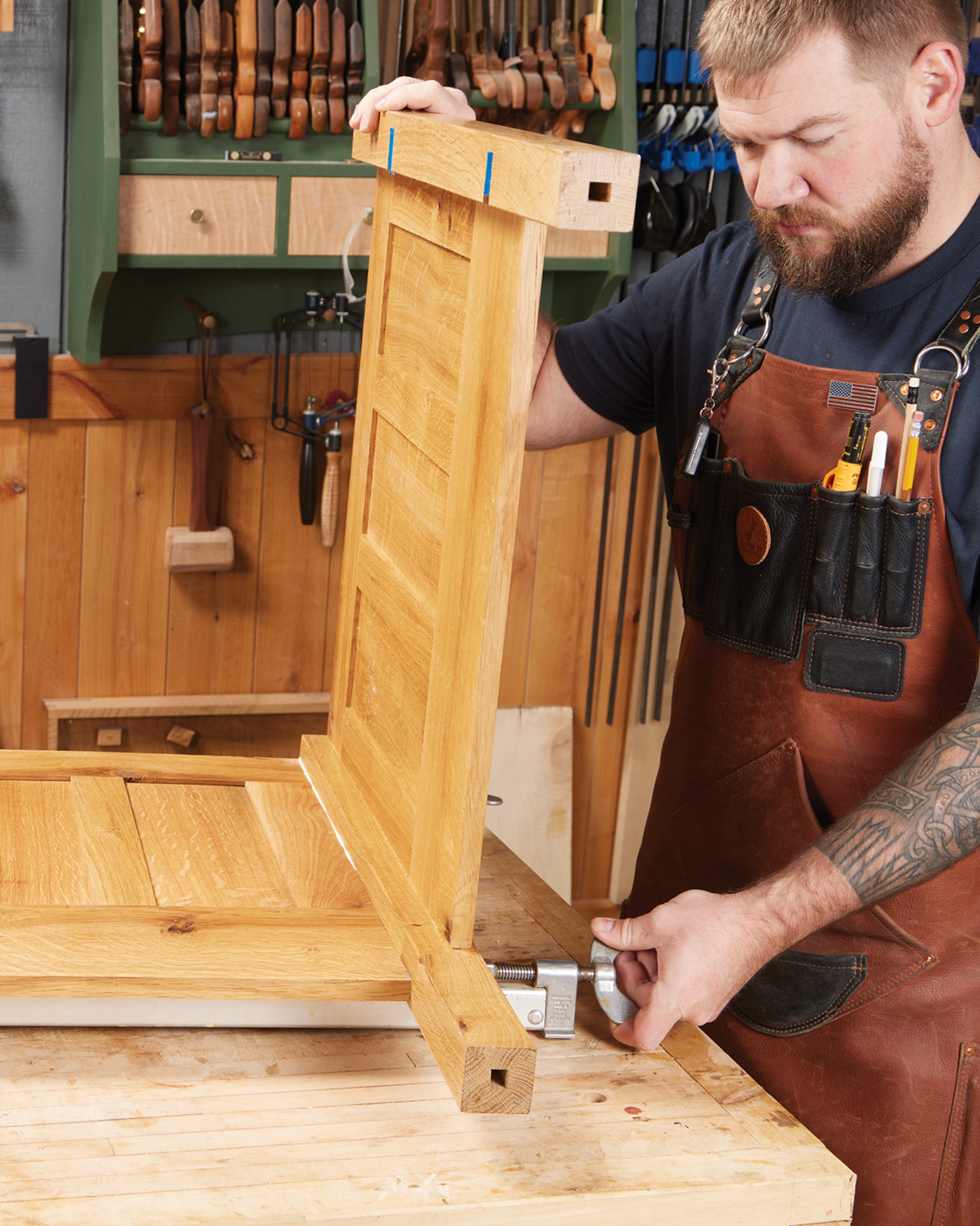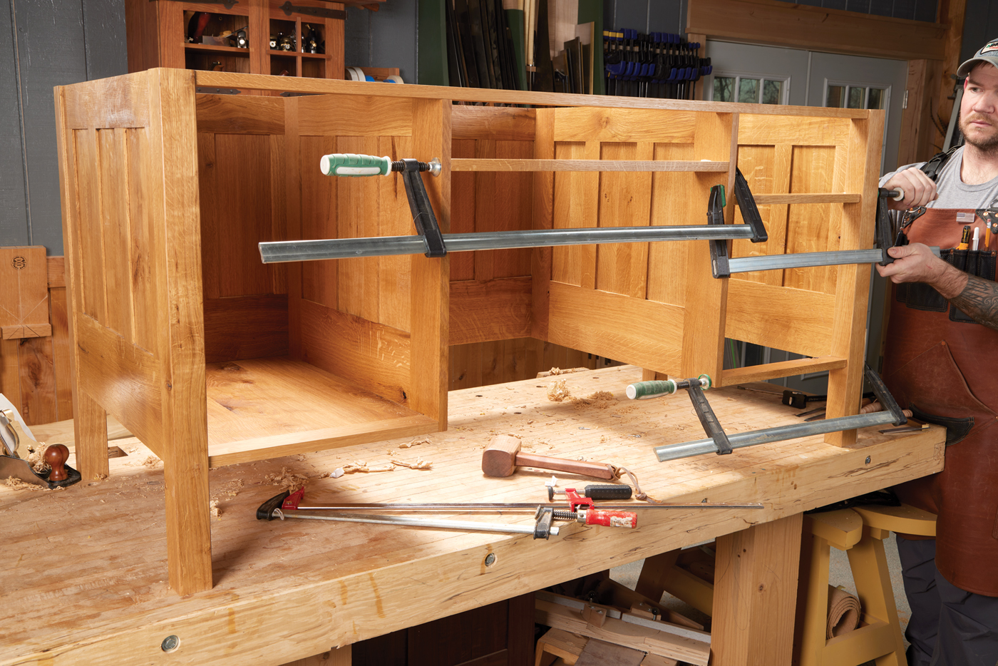 Once I had the back joint tight, I spent a few minutes taking several measurements. In theory, the tenon and groove joinery is self-squaring. However, in practice, stuff has a little flex. This is a natural material, after all. I found that the front of the desk was slightly more open than the back. So, I applied a pair of clamps across the front to pull everything square. You can find a photo of that on the Popular Woodworking Instagram page if you’re interested.