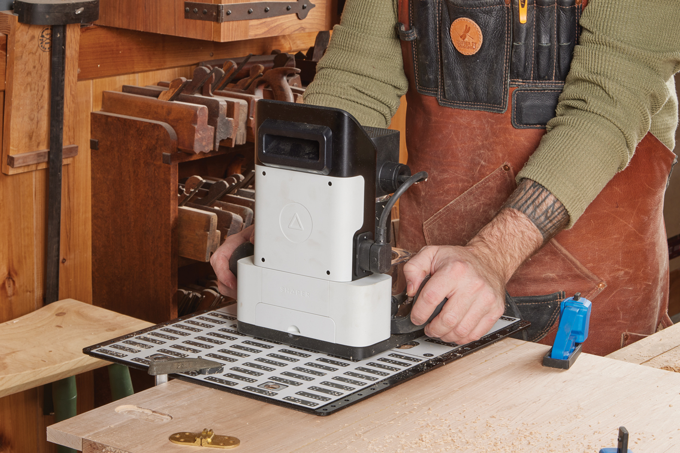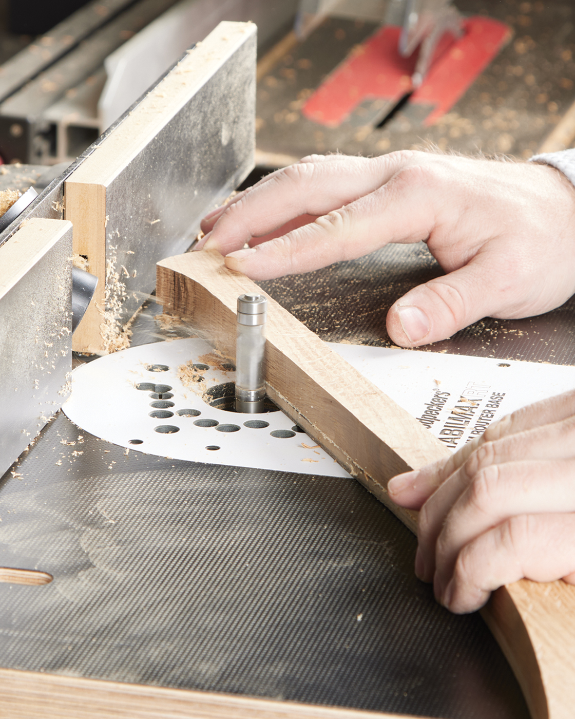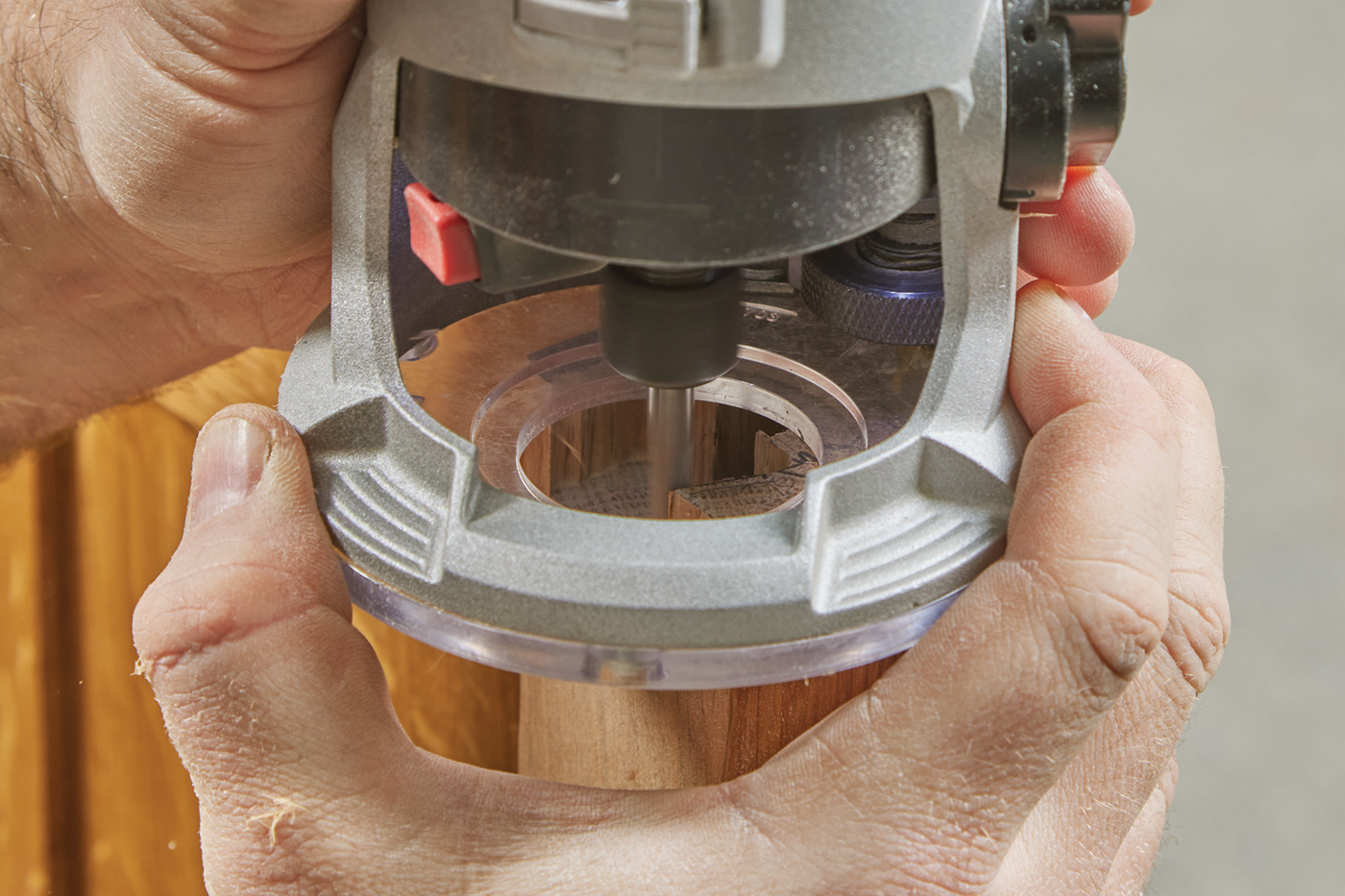 25 Remove the waste with a small router that’s easy to balance on the leg.