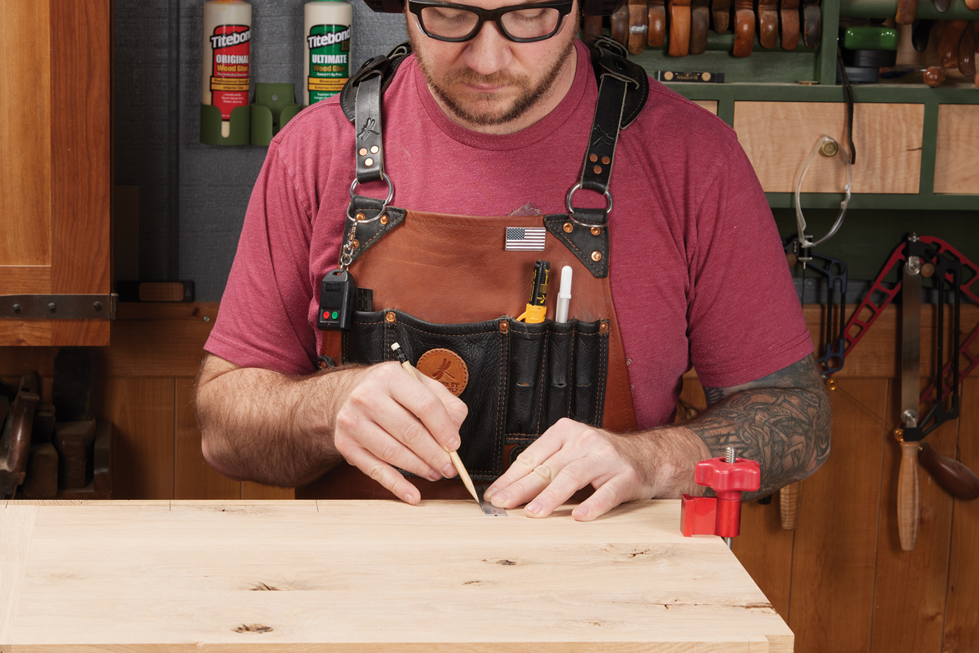 The front left, and right legs are connected via what I’m calling a “header rail.” This rail is dovetailed into the tops of each leg, and set back a 1/4“ for that reveal— we’re keeping that as a standard reveal all over. Here’s something to remember. This dovetail is hidden. You’ll never see it. It doesn’t matter if it’s sloppy, as long as the front shoulder is tight and it fits snugly. I cut the dovetail with a pull saw at the bench (photo 23). Then, clamping it on one end, I mark the opposite end with my marking knife.
