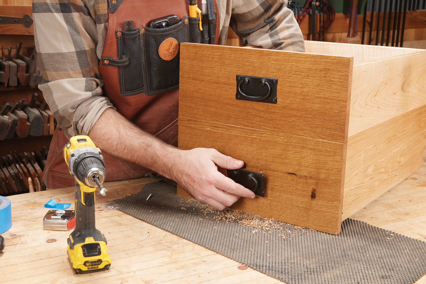 Now comes the drawers and door. The drawers are nothing crazy. Standard dovetailed drawer boxes with false fronts. I dovetailed the boxes with my PantoRouter, but do it how you’d like. The false fronts are installed with screws, and the hardware is attached. Notice that the lower drawer has a faux divider across the face of the drawer. This gives the appearance of 3 drawers, but in reality, the bottom is a deep one. It is a fun little detail. The drawers are installed with bottom-mount drawer slides, screwed to the drawer dividers, and a mounting bracket in the back of the drawer case.