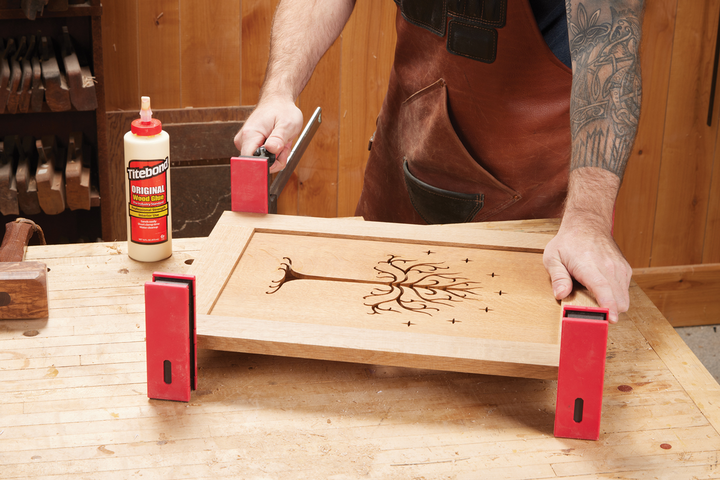 31 The dominoes are glued into place, and the entire piece is clamped to dry.