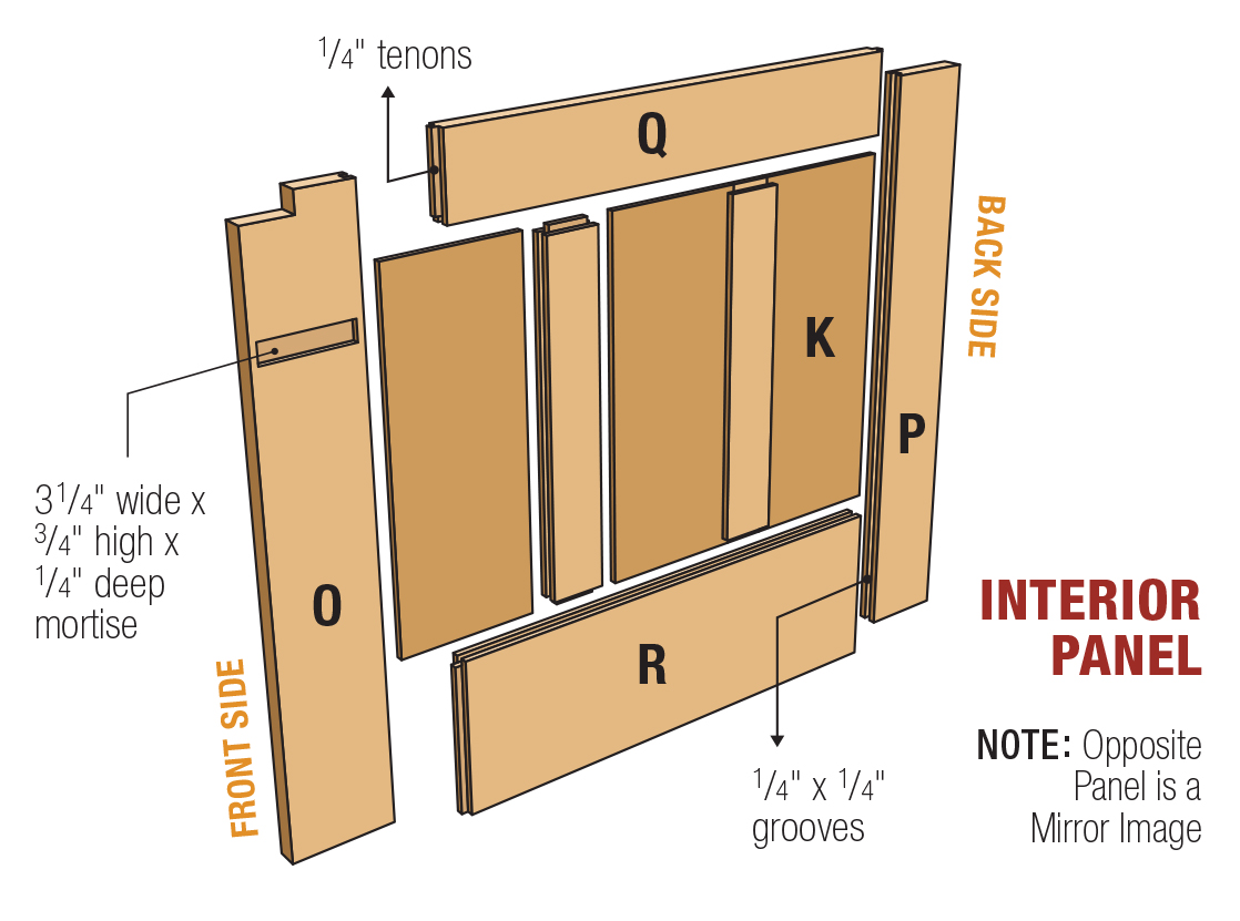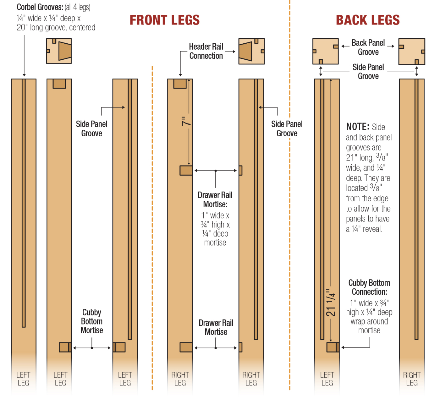 Starting on the left hand side, the front and back legs each have a groove for the outside (left) panel, and a mortise near the bottom for bottom of the cubby. This mortise wraps around the corner of the leg. The back left leg also has a groove on the inside face for the back panel.