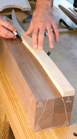 Mark the shape of the cabriole on two faces of each leg. It helps to bundle the four legs as you make these marks, slashing your chance for a disastrous error.