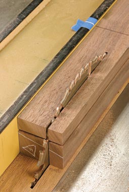 A fair amount of downward pressure ensures accuracy with this technique. If you don’t keep the board pressed down flat, it will try to rise up on you. Even a bit of this will result in a too-thick tenon. If you are not sure that you are holding the piece down firmly, make a second pass over the blades.