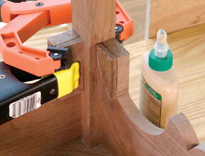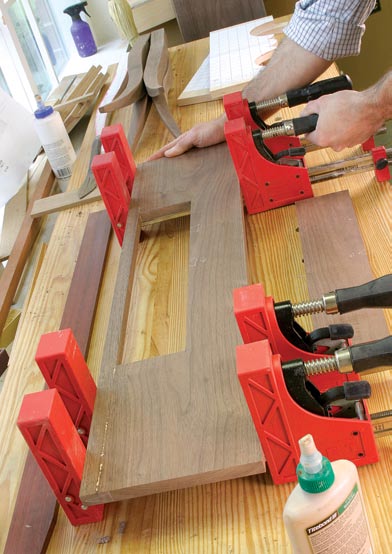 When you glue up the base, the extra waste you left on the aprons comes in handy. Though most authorities on joinery will tell you not to bother gluing the end-grain shoulder area at the bottom of the apron, I think it’s essential here. You want all the help you can get when you cut the waste away, and modern PVAs do a better job of gluing end grain than most people realize.