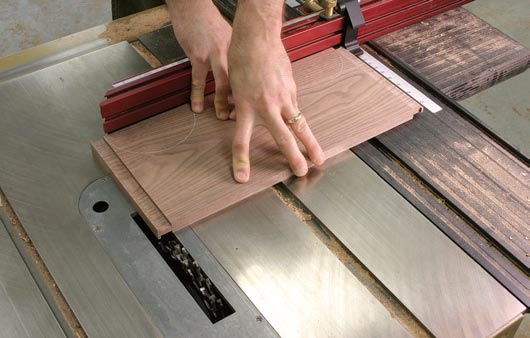 I tried different ways to go about this and the following is the least awkward method. Begin by taking the stock for your legs and cutting one long edge so it parallels the grain of the board. Rip out your four leg pieces.