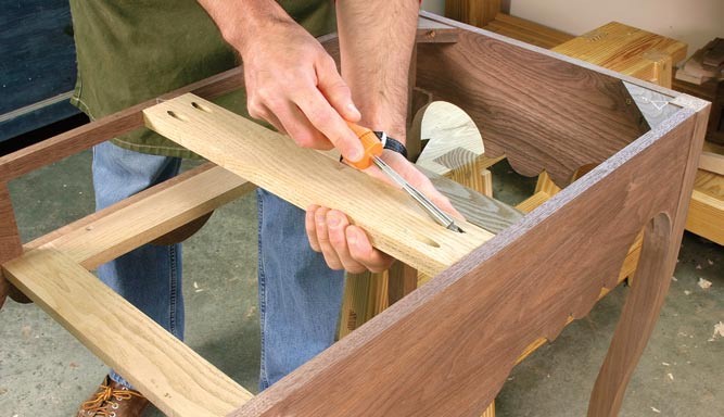 I glued in the backing blocks with spring clamps. One clamp pressed the block to the apron; the other clamp pulled the block against the leg. Here I’m removing the clamps after the glue has dried. With the clamps off, mark the final shape of the apron on the inside as shown.