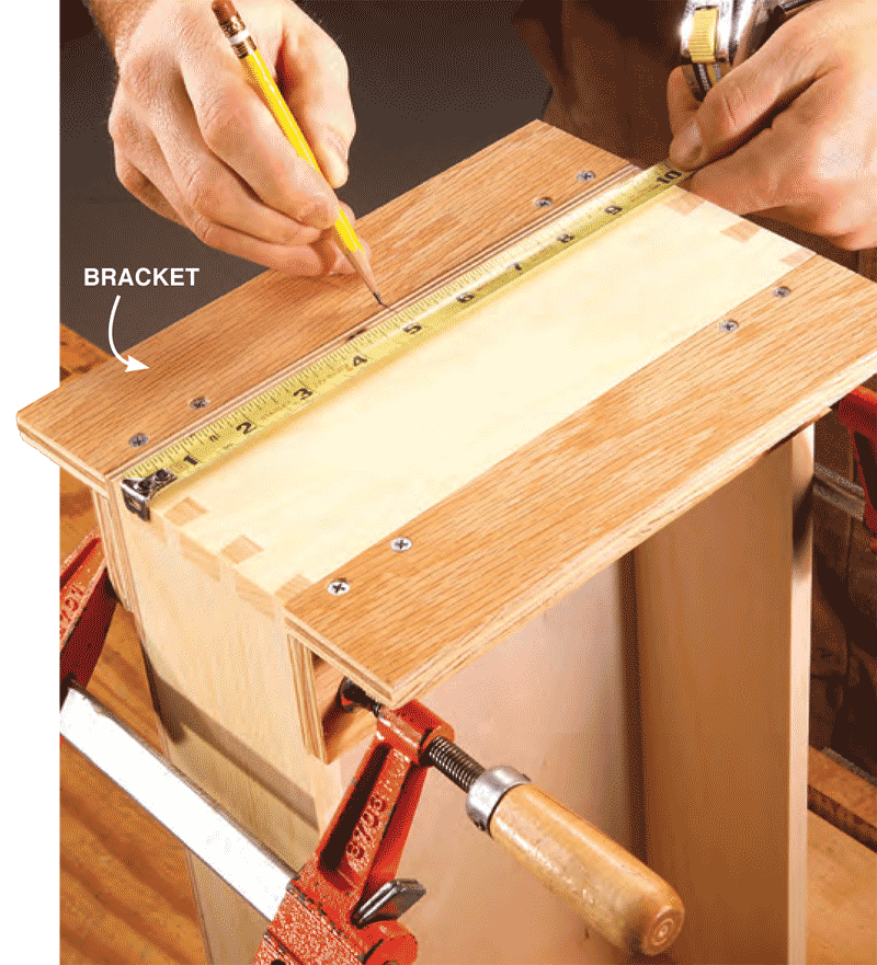 | Align the handle support’s template with the bracket’s centerline and flush with the box’s bottom. Butt two guide boards to the template. Fasten the boards to the brackets. |