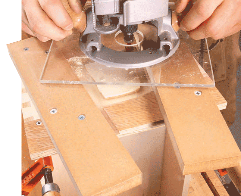 | Rout a recess with the dovetail bit you used to bevel the supports. This bit’s bearing follows the guide boards. Bridge the boards with a large baseplate. |