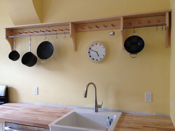 When/if the rack gets loaded with pots, the pegs – with the exception of those over the sink – may be superfluous. But the rail acts as a stretcher and helps to hold the piece together, so I needed it for structural reasons…so why not add pegs? Plus, I plan to use some of the remaining pegs to make a simple rail behind the door for coats, so together, along with the other Shaker elements in the kitchen, that will help aesthetically tie things together.