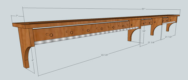 I did a dry-fit of sorts (the pieces are just screwed together, so “dry-fit” is a bit of a joke) at my bench, so I could decide on the width of the peg rails by eye. I wanted to make sure the pegs would be above the steel bar so that one could see them, but with a sufficient gap in between the bottom of the shelf and the peg rail. What looked right to my eye was 2-1/2″ wide; your eye may vary.