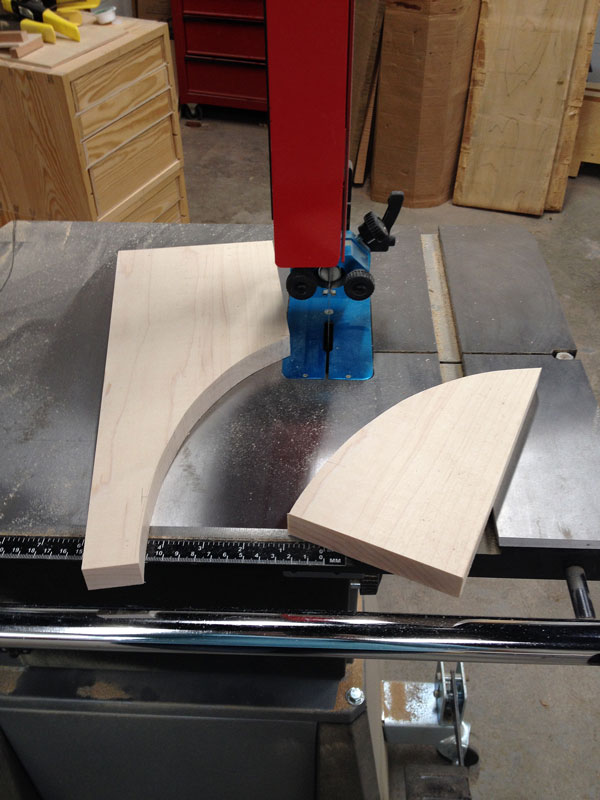 Then I sketched out the curve on one upright, dropping down 5″ from the top and coming in 1-1/4″ from the back edge for the endpoints of the curve. Once I was happy with how it looked (that took a few iterations), I cut it at the band saw, faired the curve on a spindle sander, used the first upright to mark the rest, and repeated the cutting and fairing steps on the remaining three pieces.
