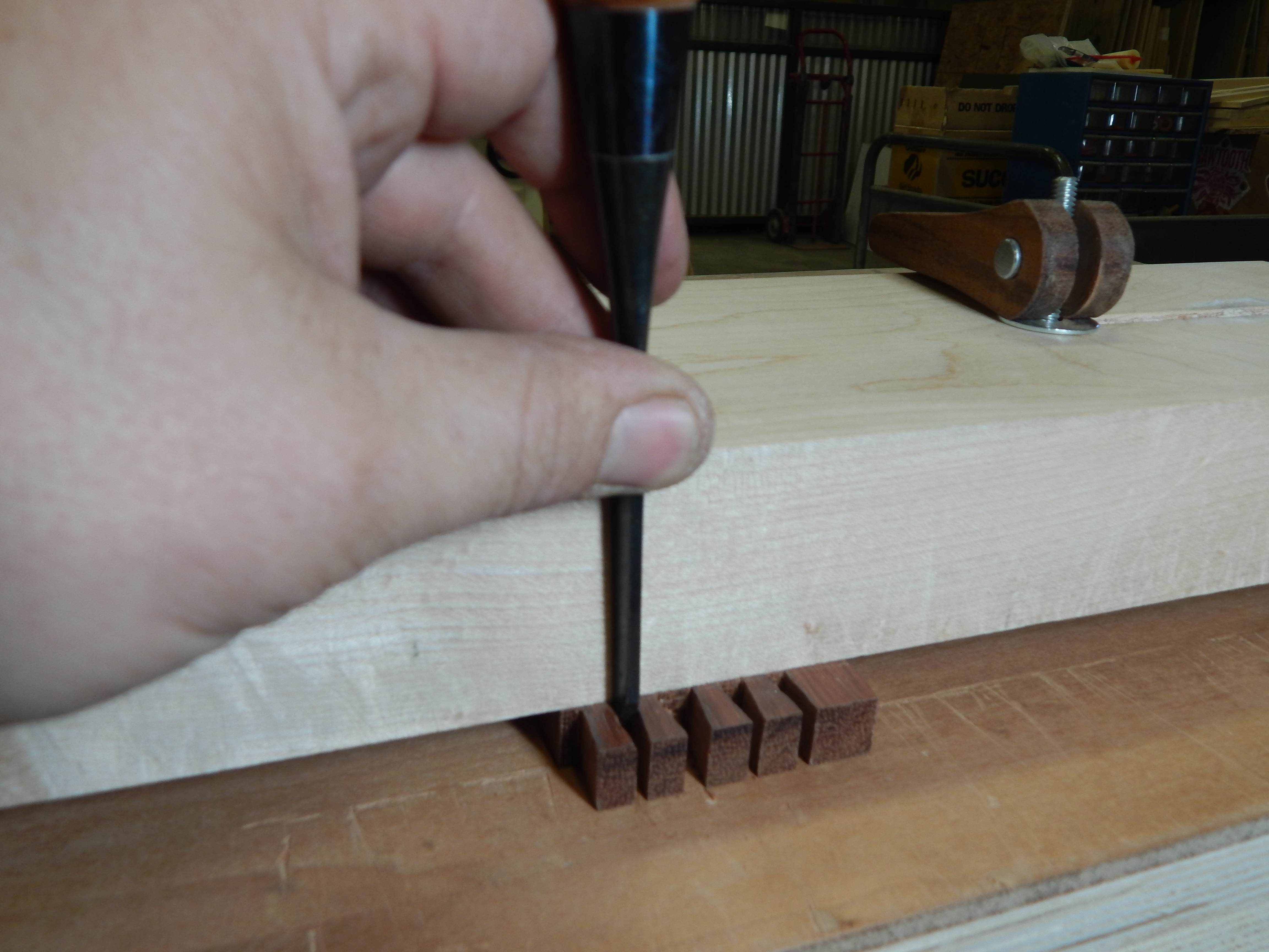 Here I've just got the first tails cut on one end of the first side. I set it up so you can see the proportions that I'm going for. Notice that there's no dovetail at the top edge. That's so I can cut a groove for the rabbeted top. Also, I left it a bit thick to allow for a little sculpting of the top edge. The 3/4" chisel is there for reference. I really enjoy making pieces like this – no plans, no measuring – just decide what looks good to your eye and go with it. I'll keep you posted on the progress as I go.