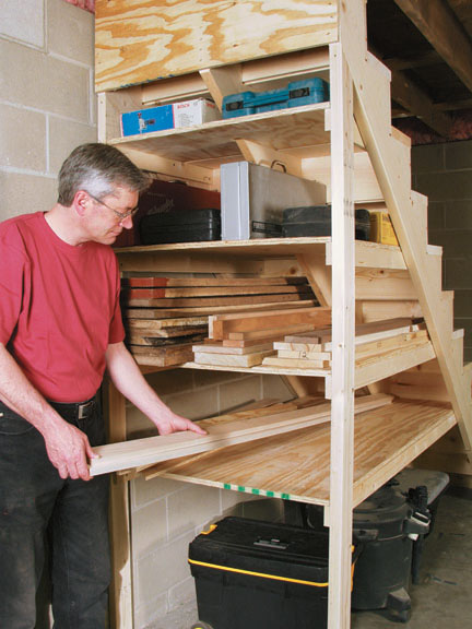 In my basement shop every square inch counts! Out of necessity I found a wealth of unused space tucked right under my nose, or should I say feet. That awkward space under the basement steps can easily be turned into a set of deep shelves perfect for storing everything from tools to shop vacuums, and of course, lumber. Help your small shop seem a lot bigger by using this highly underutilized space.