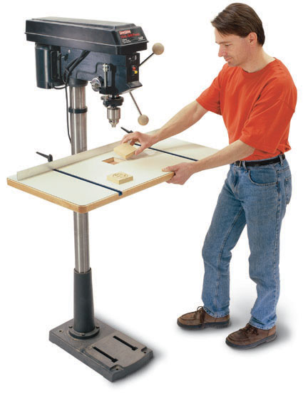 I built this auxiliary drill press table to give me the extra support and room I need when drilling cabinet doors and sides. The core is MDF but particle board would also work fine. I edged my table with oak to make the edges more durable. The plastic laminate provides a smooth surface to work on and should last a long time. Having plastic laminate on both sides keeps the table stiff and stable. The table insert is replaceable and the fence is quick and simple to adjust. The T-slot tracks make it easy to add other jigs and fixtures. My table measures 18" x 35-1/2" and has proved to be a good size for most work. I bought all the parts at my local home center and woodwroking store for about $75.