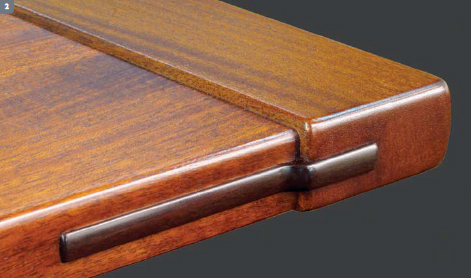 More Greene and Greene details enhance the design by visually implying solid construction. Ebony pegs and exposed breadboard splines add visual strength to joints, even though they’re non-functional. And a feature that I call the Greenes’ “relief detail” calls for every structural element (real or perceived) to exist in its own plane, so that no two elements meet at the same level (2). Here, steps between the top, breadboard end and spline highlight each joint and structural member.