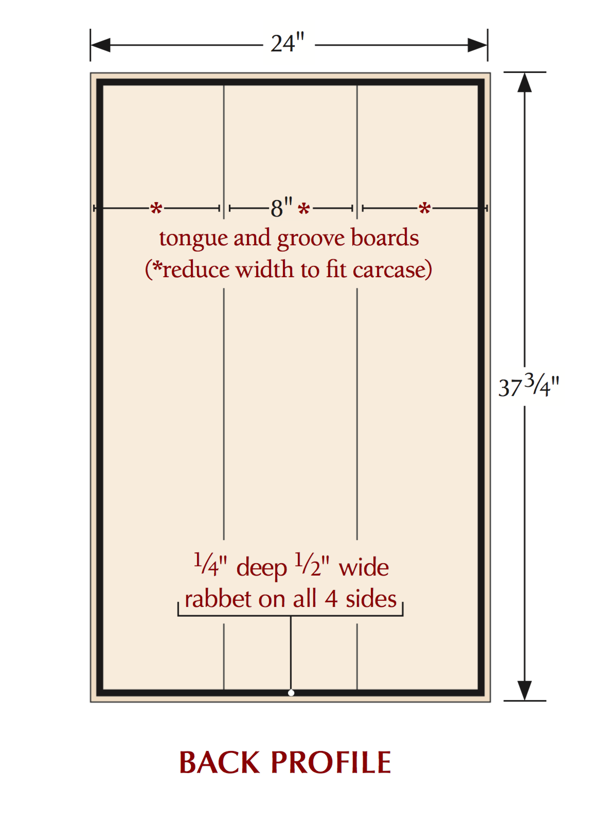 Once the panels are tongue and grooved and fitting nicely, glue just the long edges of the two outer boards into the rabbets on the case sides. Then nail the boards to the top and bottom of the case and to the rear edge of the partition. I used 4d wrought head nails from Tools for Working Wood, as these have excellent holding strength and look great. The nails securing the ends of the boards need to be angled slightly so that they pass through the boards and into the ends of the casework; a small bevel is useful for sighting the angle while drilling the pilot hole.