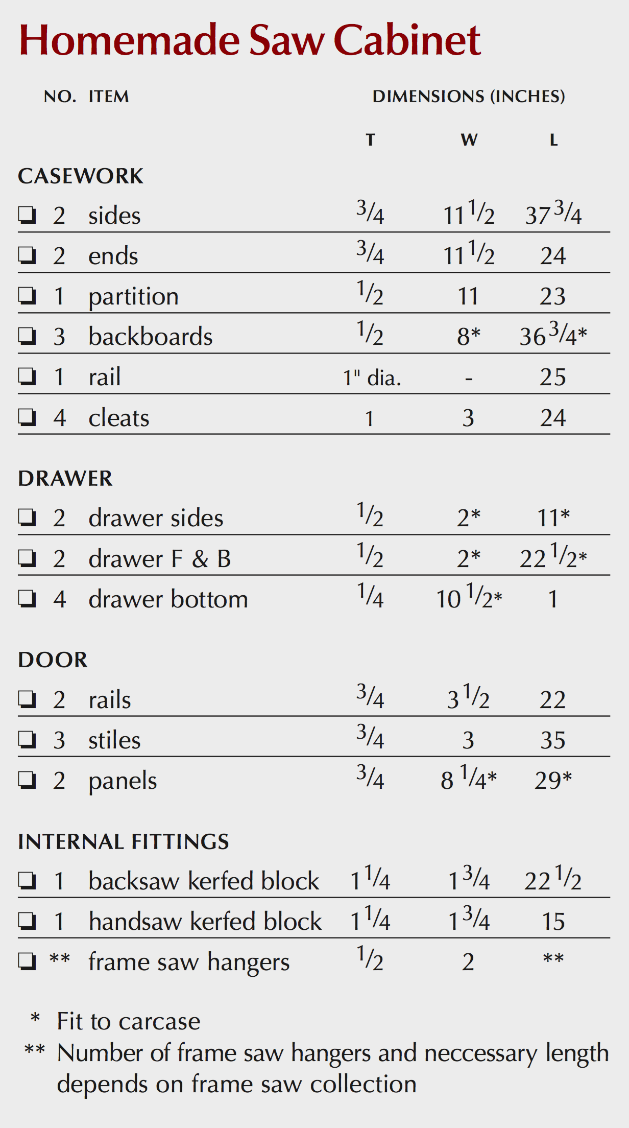 I built my saw cabinet out of what is sold in the UK as Canadian yellow pine (Pinus strobus, aka Eastern White Pine) as it is lightweight, strong, and dimensionally stable. Other similar softwoods would be appropriate, and hardwoods would also be fine although you may want to beef up the French cleats to account for the extra weight of a hardwood cabinet. The kerfed blocks which capture the saw plates are hard maple, to provide wear resistance, while the rail on which the saw totes rest is a length of 1” hardwood dowel of the sort most timber yards and big box stores sell. You could, of course, turn your own rail if you have a lathe and want some extra practice. See the cut list at the end of this article for the components.
