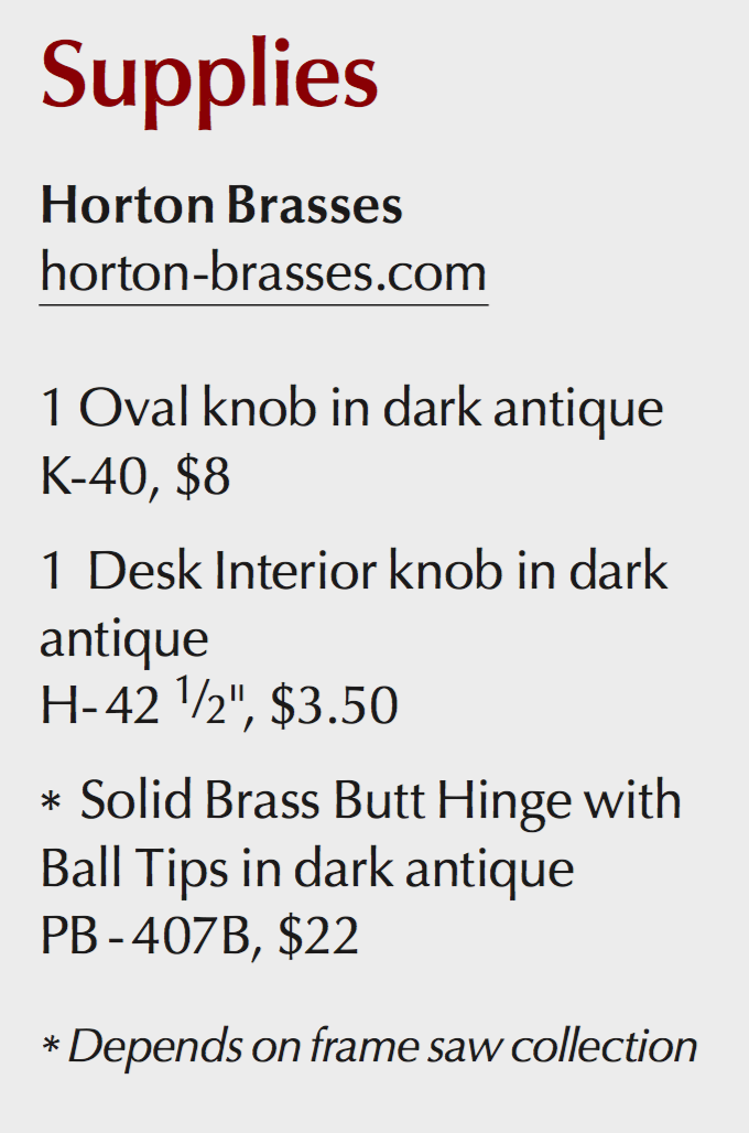 Frame saws take up a disproportionate amount of space in my toolchest, so I decided to mount them on the inside of the door of the saw cabinet. Each hanging bracket is made of two pieces of 2” wide 1⁄2” thick stock. Glue the two pieces together so that they overlap by 3⁄4“.