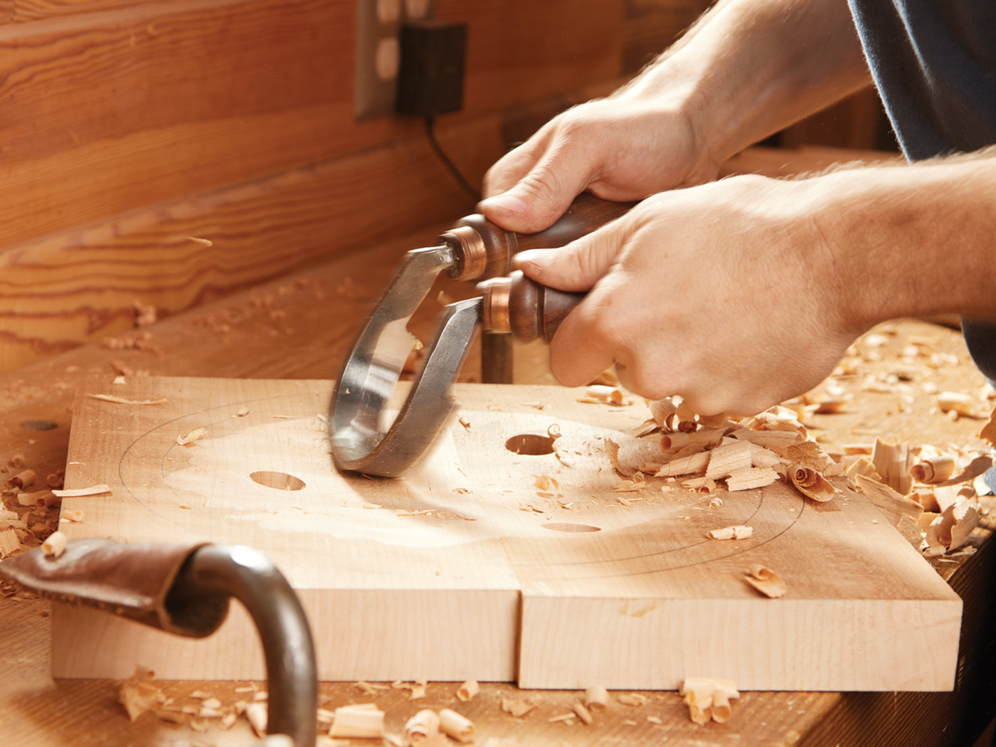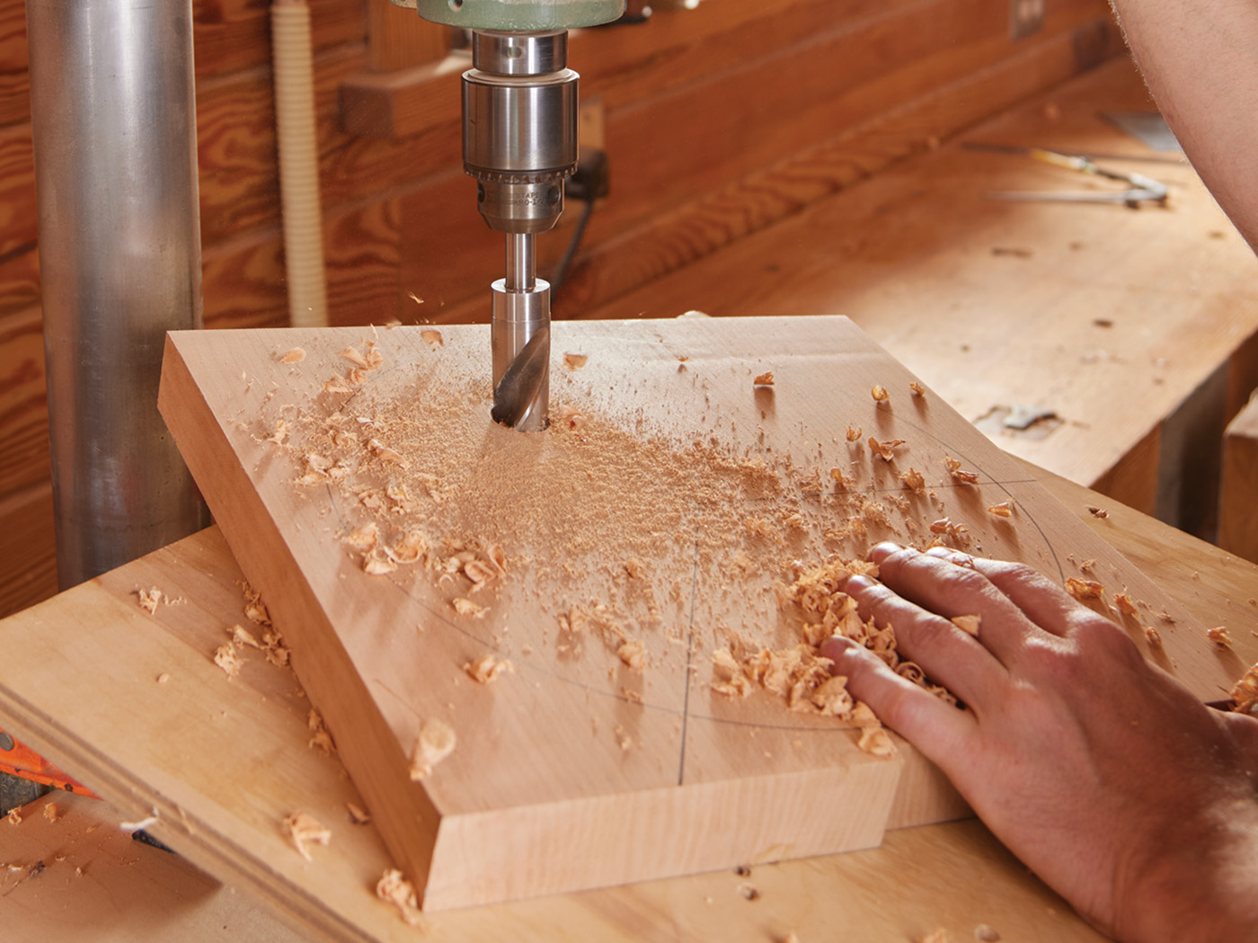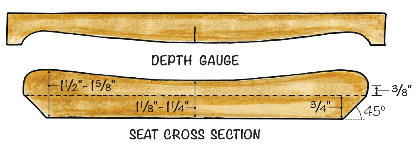 Now that those layout lines are done, you will make a depth reference, so you know how deep to carve. Using a 1/4“ bit, drill a 3/8“ deep hole on the center mark. Then, using your tools of choice, be that a scorp, travisher, gouge, or grinder, carve the dished portion of the seat, stopping at the bottom of the depth hole and using the line drawn with the compass set to 4-3/4“ as your guides. I shoot for a perfect inverted dome shape, then finish it up with sanding.