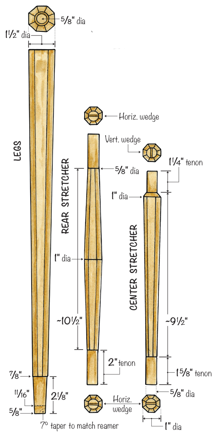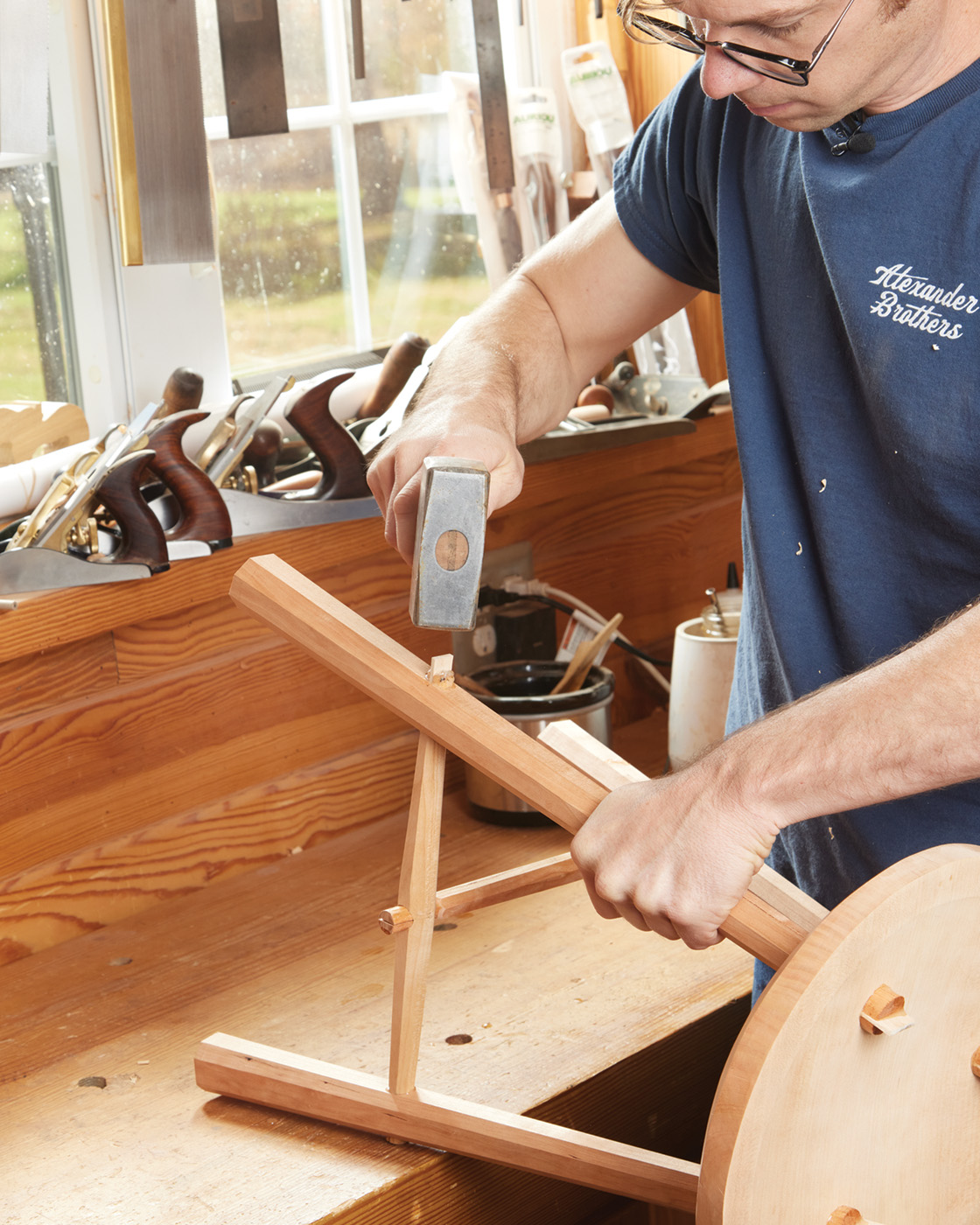I begin by gluing the stretchers into a “T” and then gluing them into the legs. Now, this leg assembly can be glued into the seat. Begin the wedging by driving each leg into the seat, listening for a sound change when it is tight. Insert the wedges with glue and drive them home. Lastly, we check the rotation of the center stretcher and drive home the stretcher wedges with glue. Be very gentle driving home the stretcher wedges as they do not need a lot of force to seat them, and you don’t want to split the stretchers or the legs.
